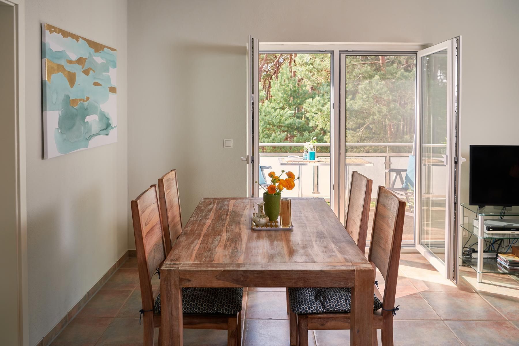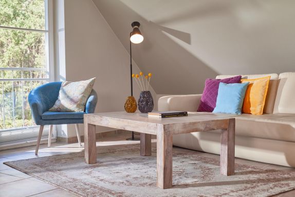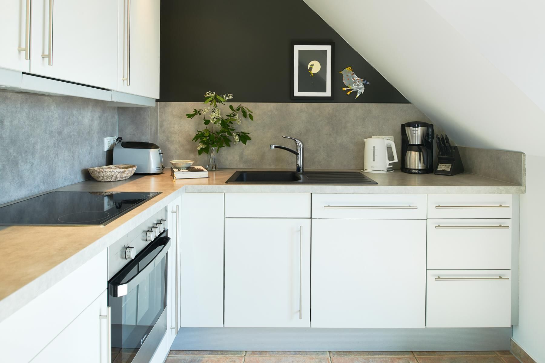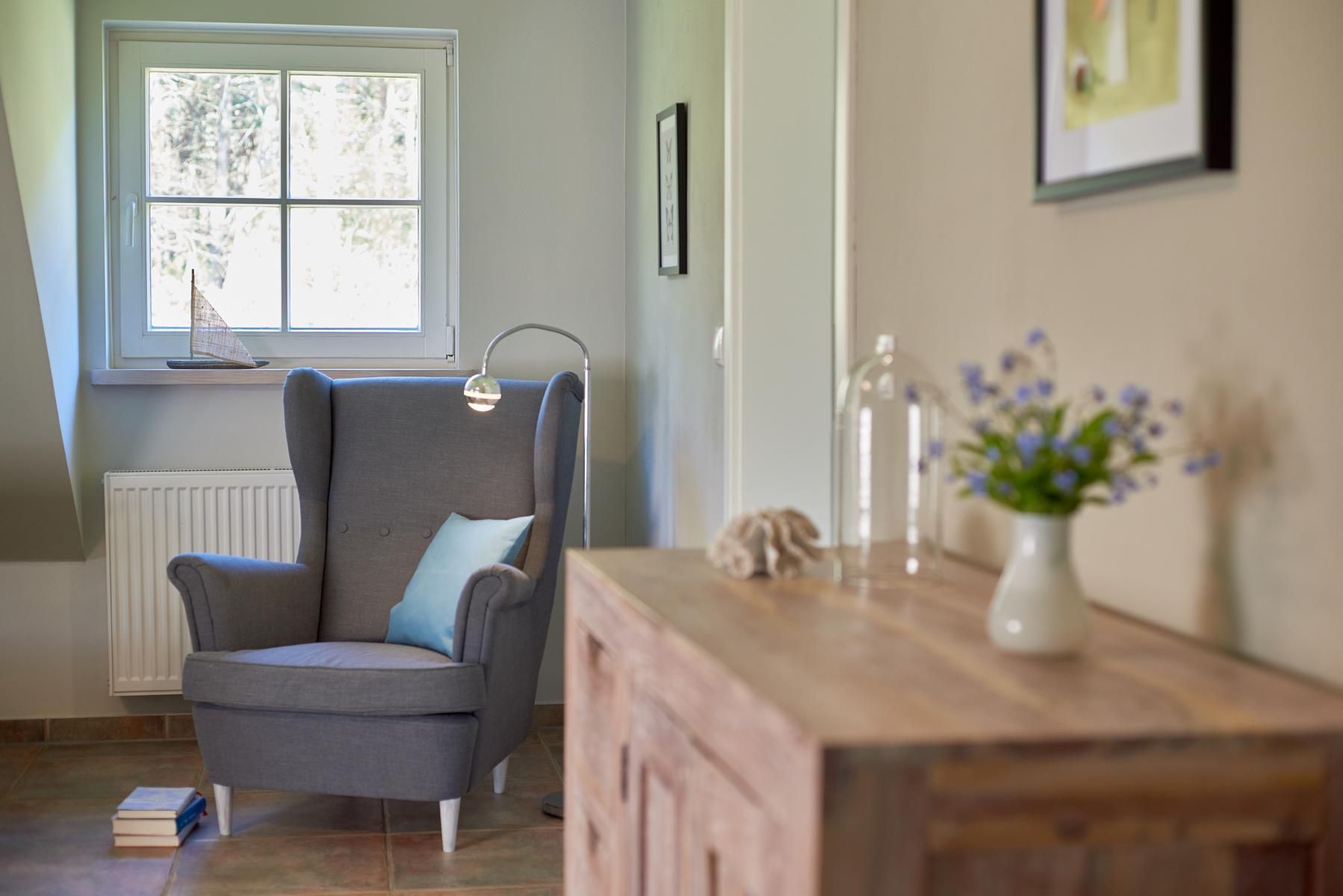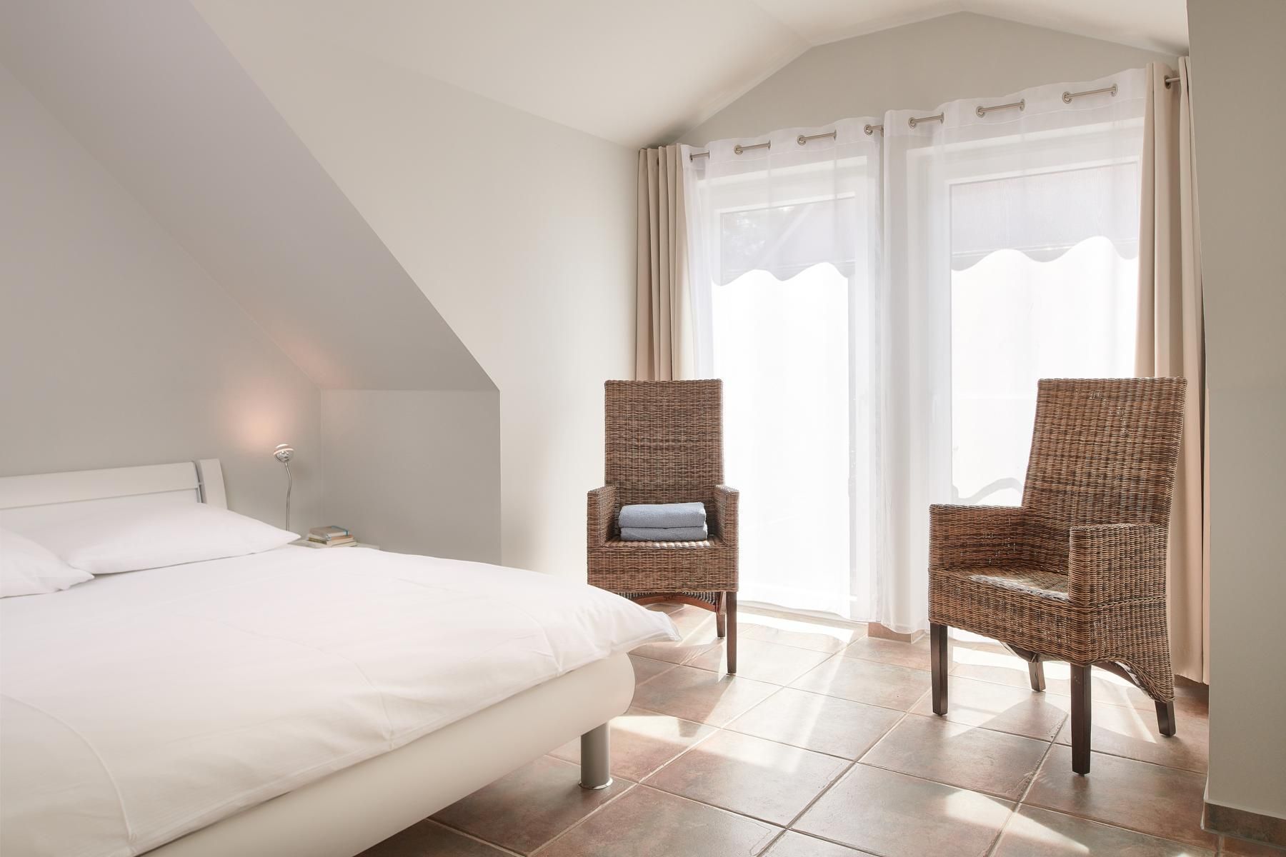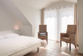 Das Bad verfügt über Doppelwaschtisch, Fön sowie ebenerdiger Dusche. Nach einer langen Fahrradtour oder einem Winterstrandspaziergang können die integrierte Sauna und der Kaminofen für wohlige Wärme sorgen. Im Sommer werden Sie auf dem Balkon den herrlichen Sonnenuntergang genießen.