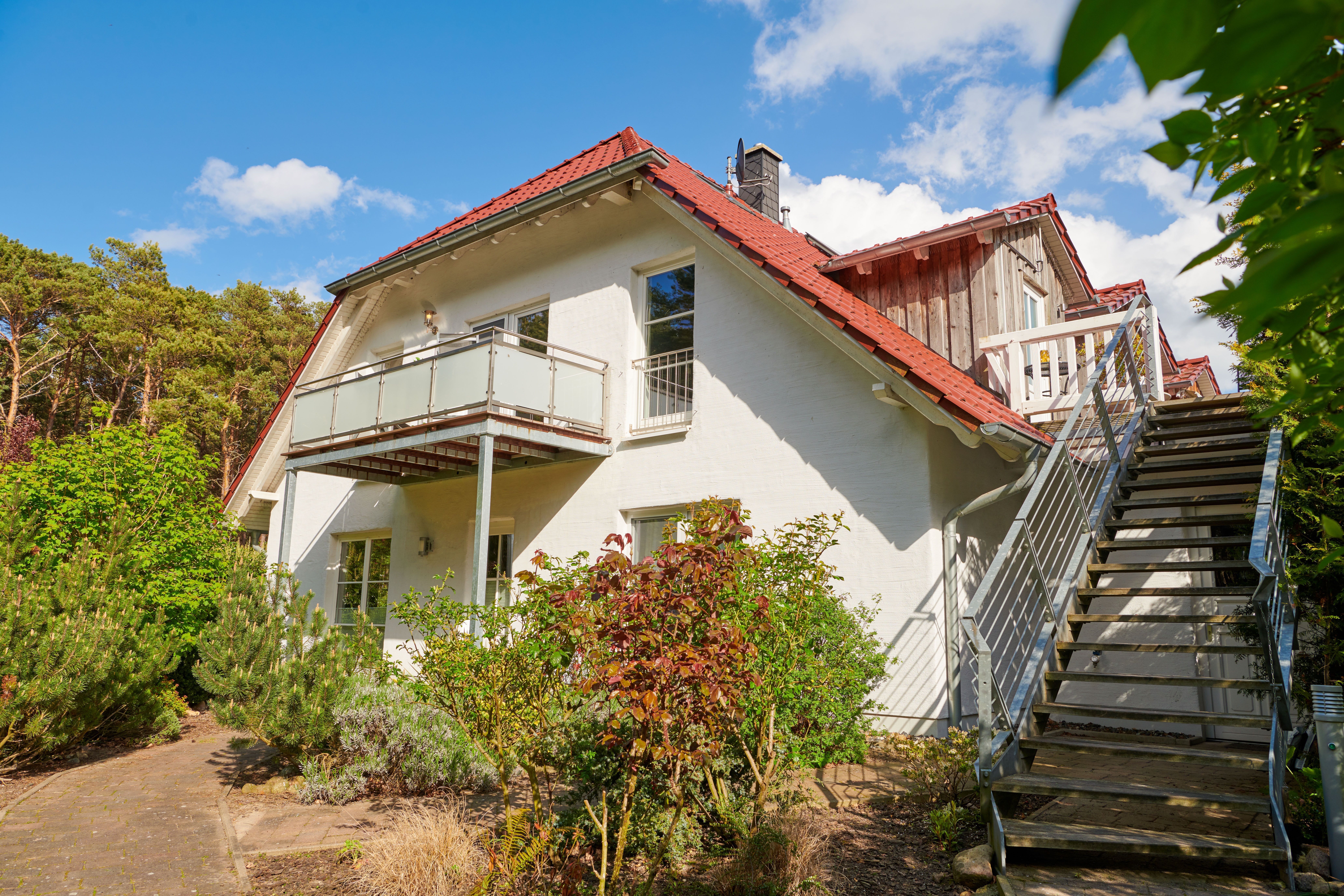 Der Zugang zur oberen Wohnung führt über eine breite, aussenliegende Treppe.