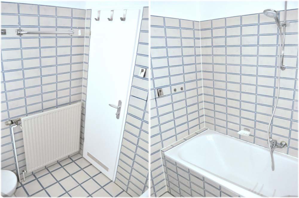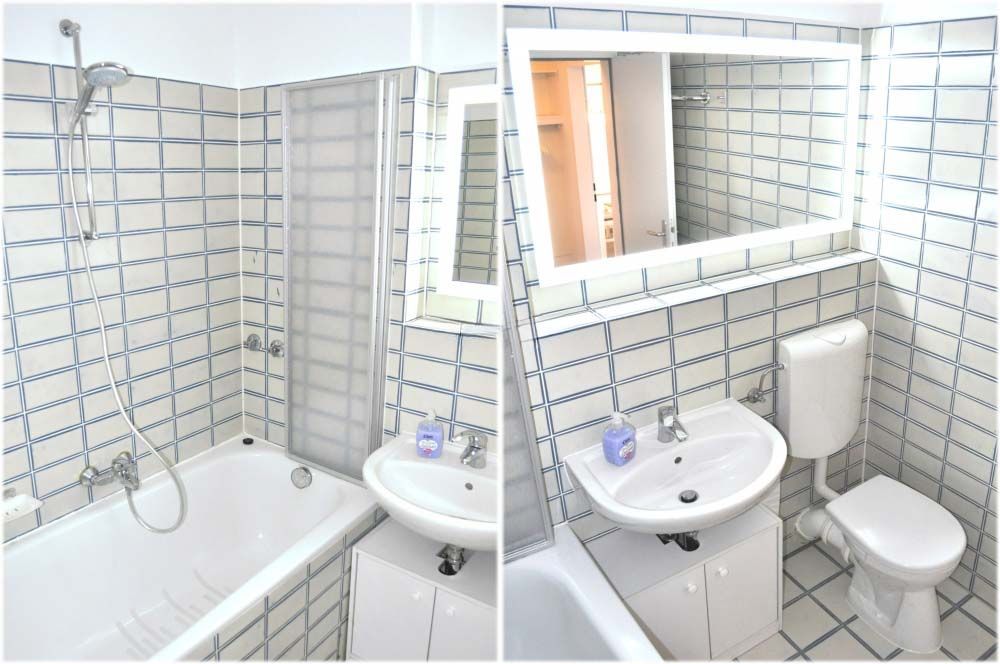 Bad 1: Badewanne, Duschwand, Spiegel, Waschbecken, WC