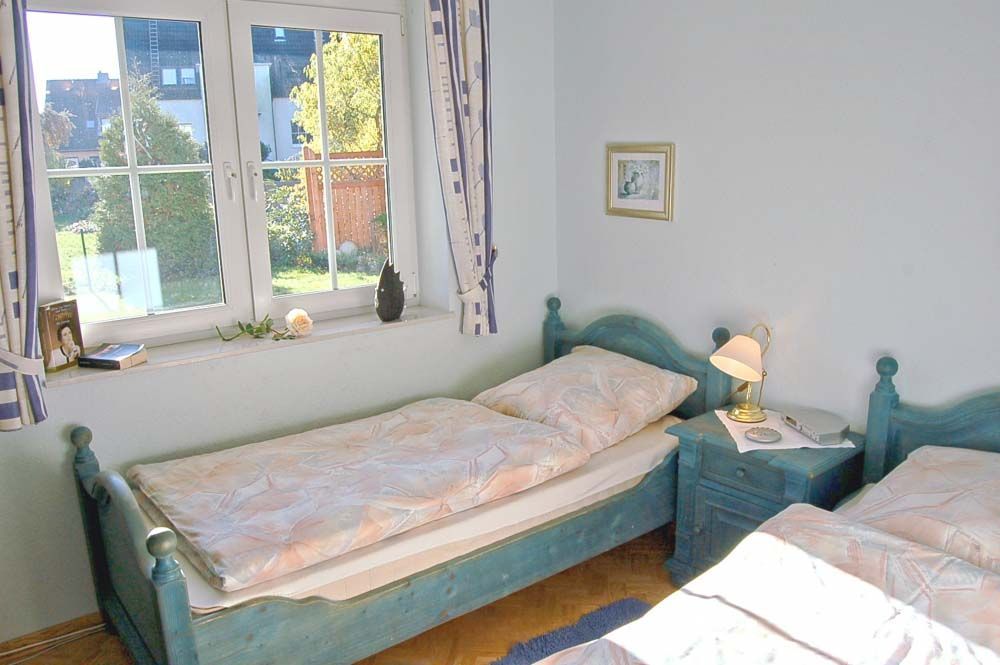 Schlafzimmer 1: 2 Einzelbetten, 2 Stühle, DVD-Player, elektrische Aussenrollladen, Kabel-TV, Kleiderschrank, Nachttisch, Radiowecker
