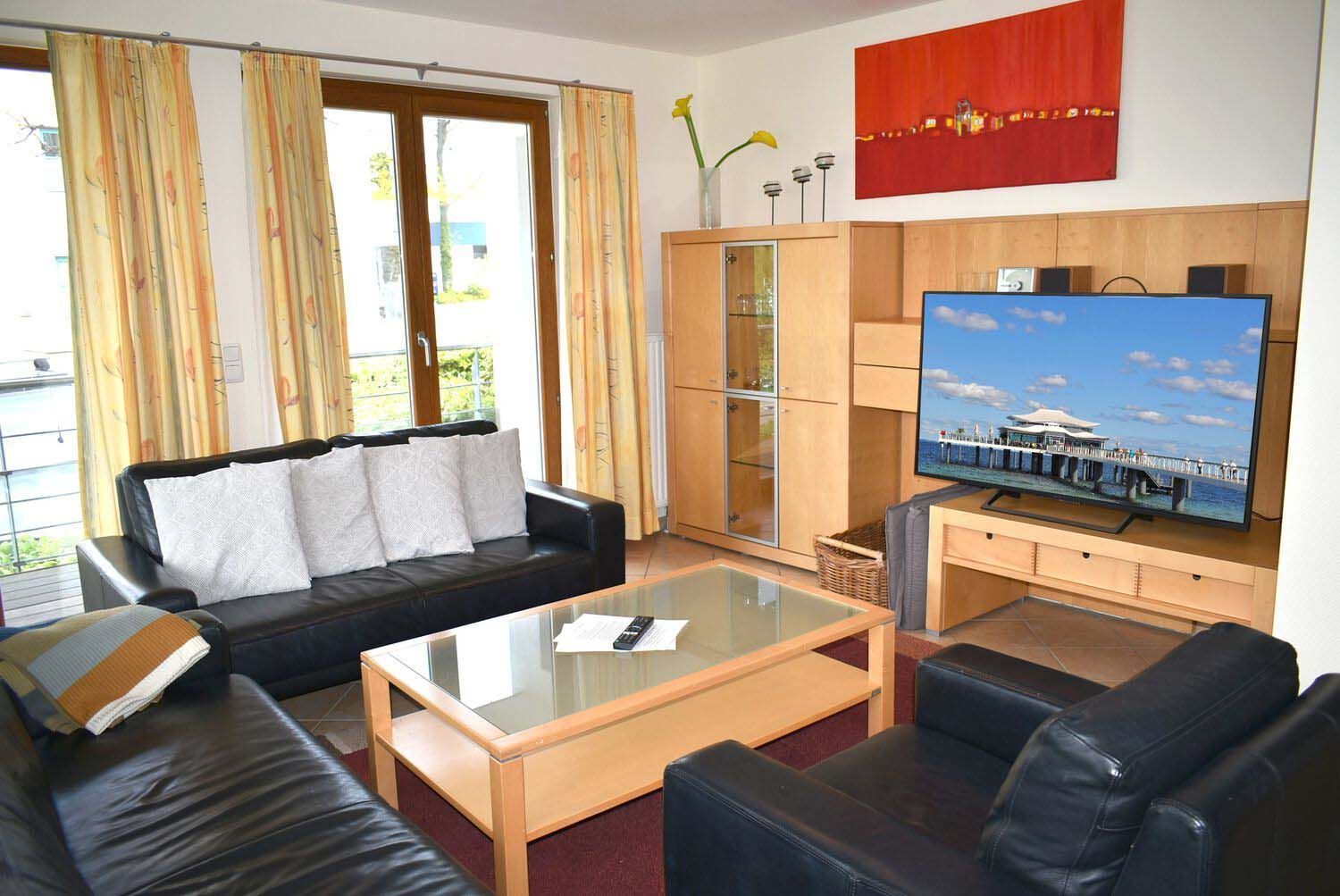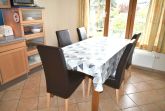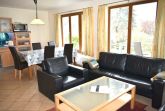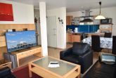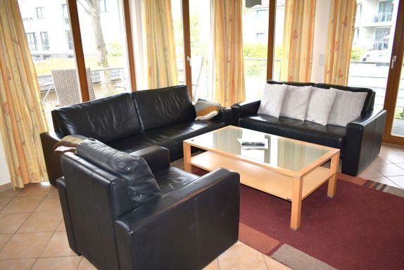 Wohnzimmer: 4 Plattenherd mit Backofen, Couch, Einbauküche, Essecke, Geschirr, Hocker, Kaffeemaschine, Kochtöpfe, Kühlfach für Getränke, Kühlschrank, Mikrowelle, Sat-TV, Schrank, Sessel, Spülmaschine, Tisch, Wasserkocher