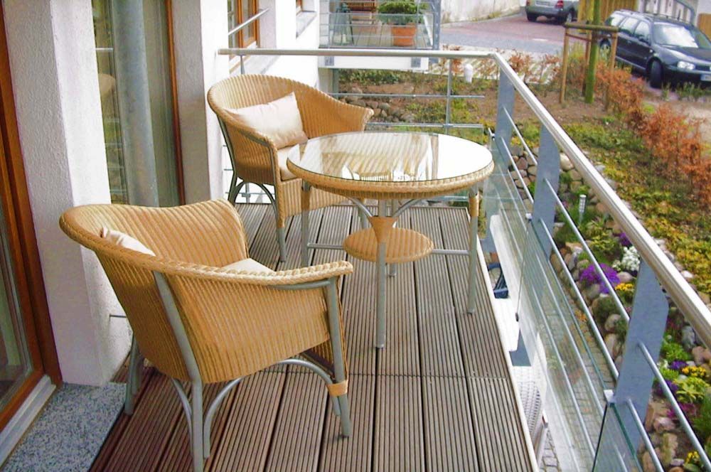 Balkon: 2 Sessel, Balkon geht über zwei Aussenseiten, Nord- Westlage, Tisch