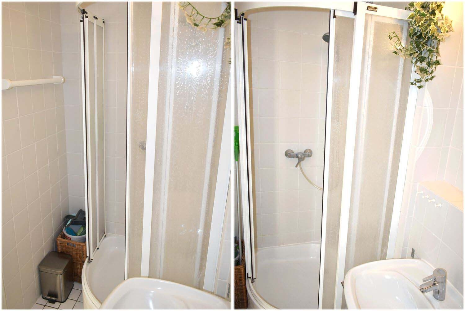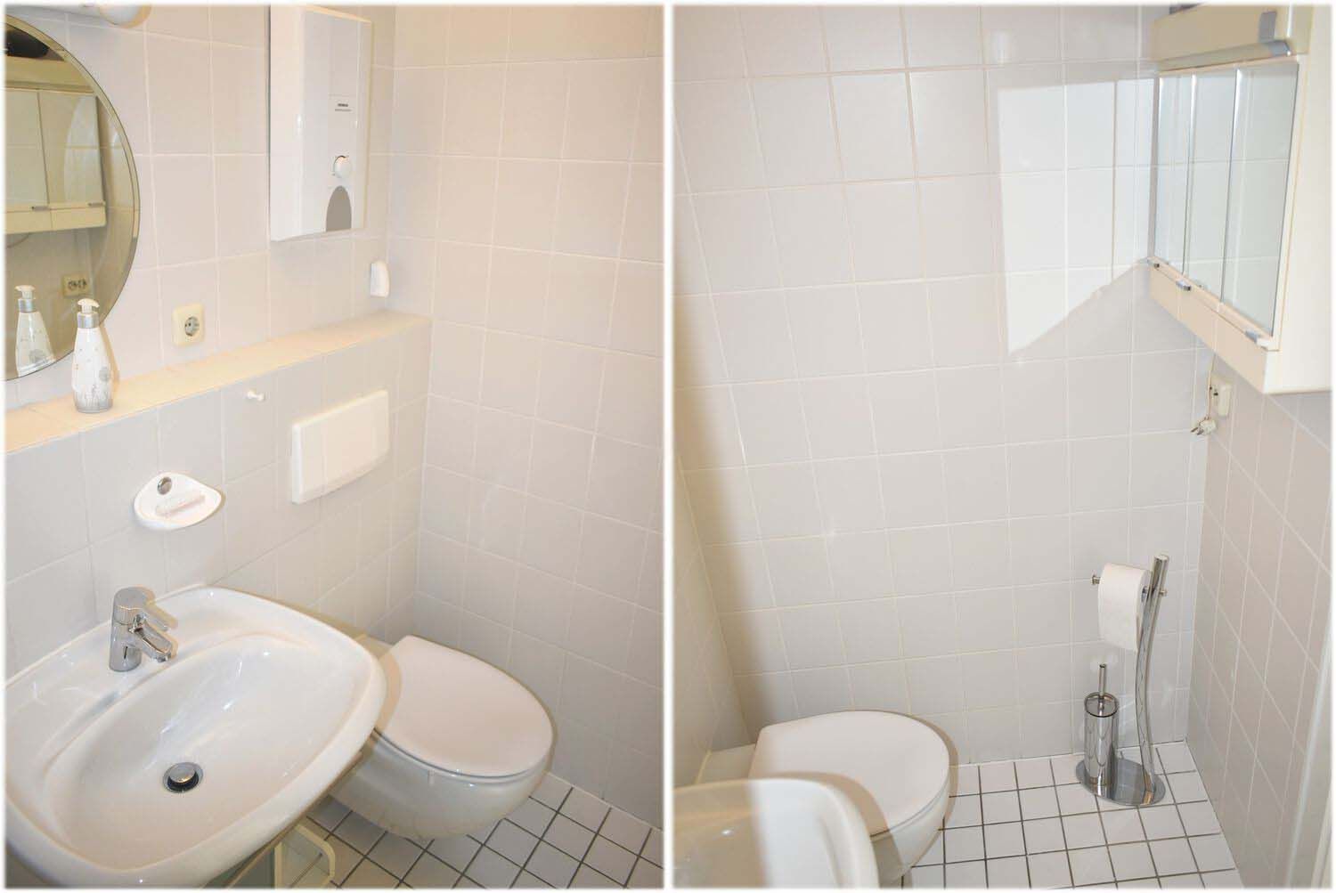 Bad 1: Dusche, Duschkabine, E-Heizung, Spiegel, Spiegelschrank, Waschbecken, WC