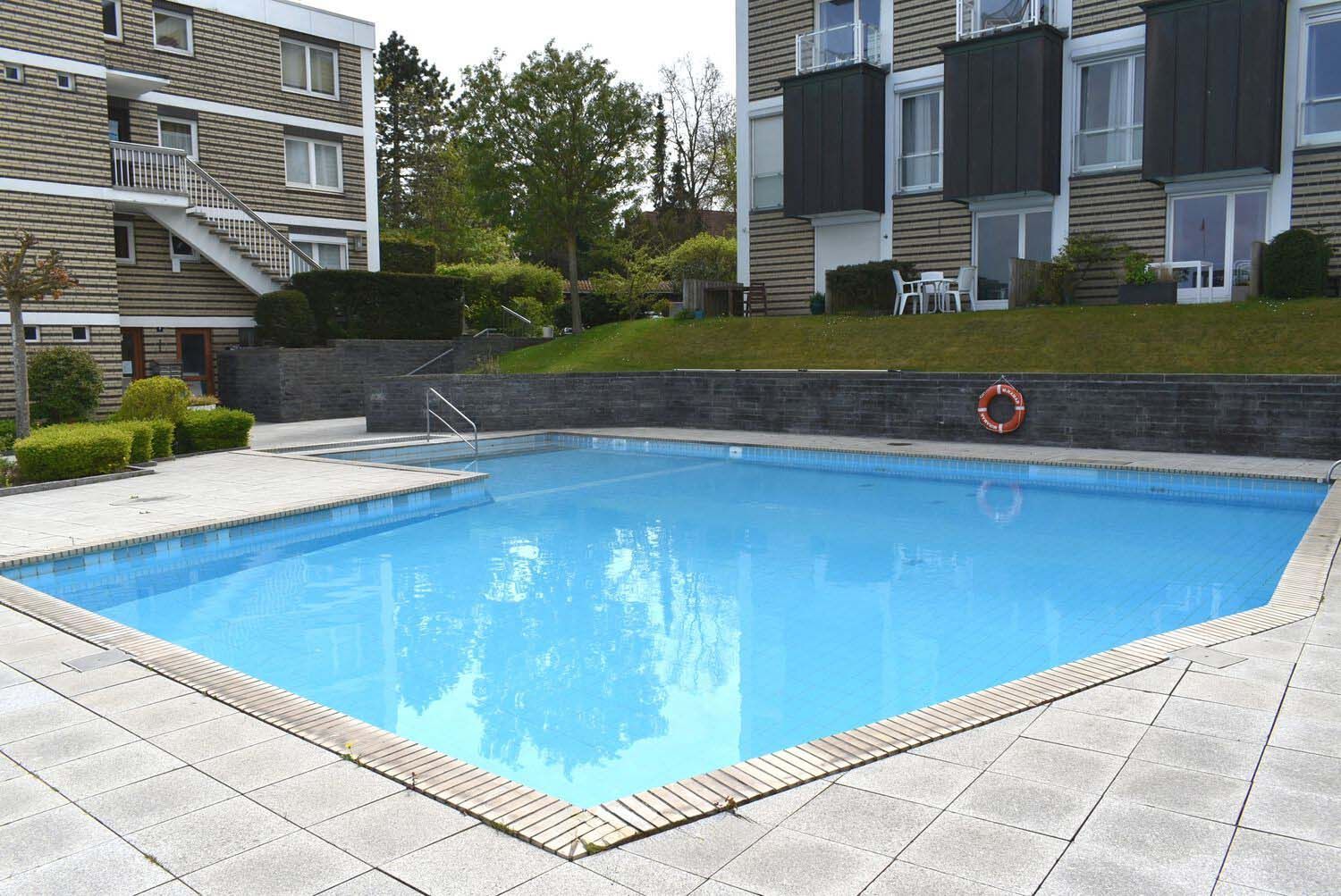 Terrasse: Außenschwimmbadterrasse für die Gemeinschaft mit Bänken und Sonnenstühlen