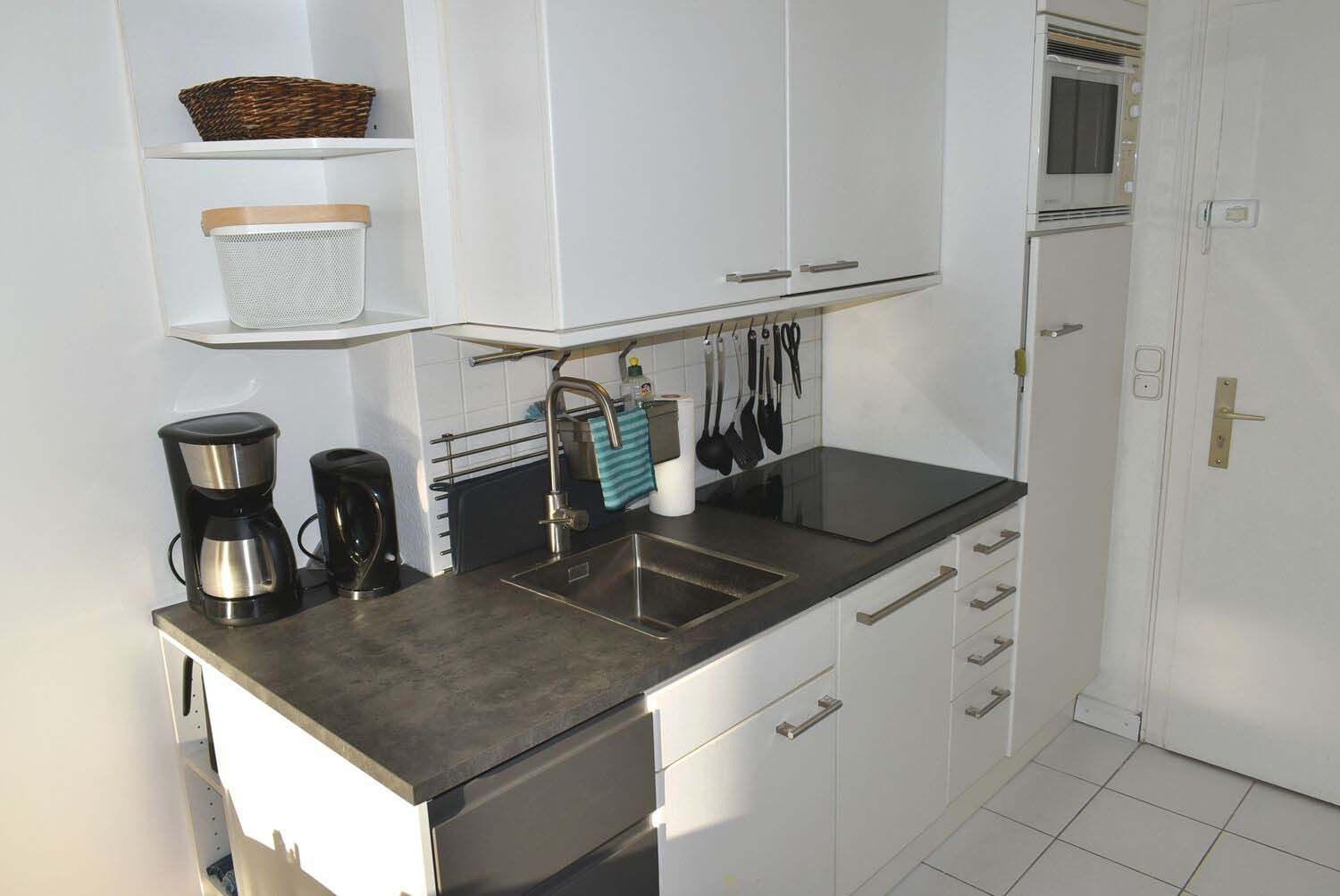 Wohnzimmer: 2 Hocker, 4 Stühle, Couchtisch, Esstisch, Filterkaffeemaschine, Flachbildschirm, Geschirr, Induktionskochfeld, Kochtöpfe, Küchenpantry, Kühlschrank mit 3* Gefrierfach, Ledercouch, Mikrowelle, Relaxsessel, Spülmaschine, Staubsauger, Stehlampe, Treppe nach oben, TV-Unterschrank, Wasserkocher
