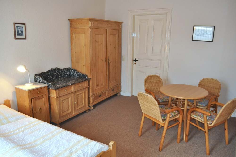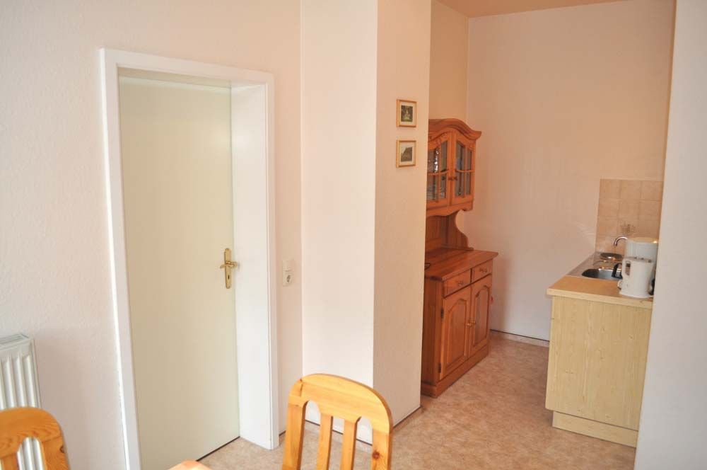 Schlafzimmer 1: 2 Einzelbetten, 2 Plattenherd, Essecke, Geschirr, Kaffeemaschine, Kochtöpfe, Küchenzeile, Kühlschrank, Radio, Wasserkocher