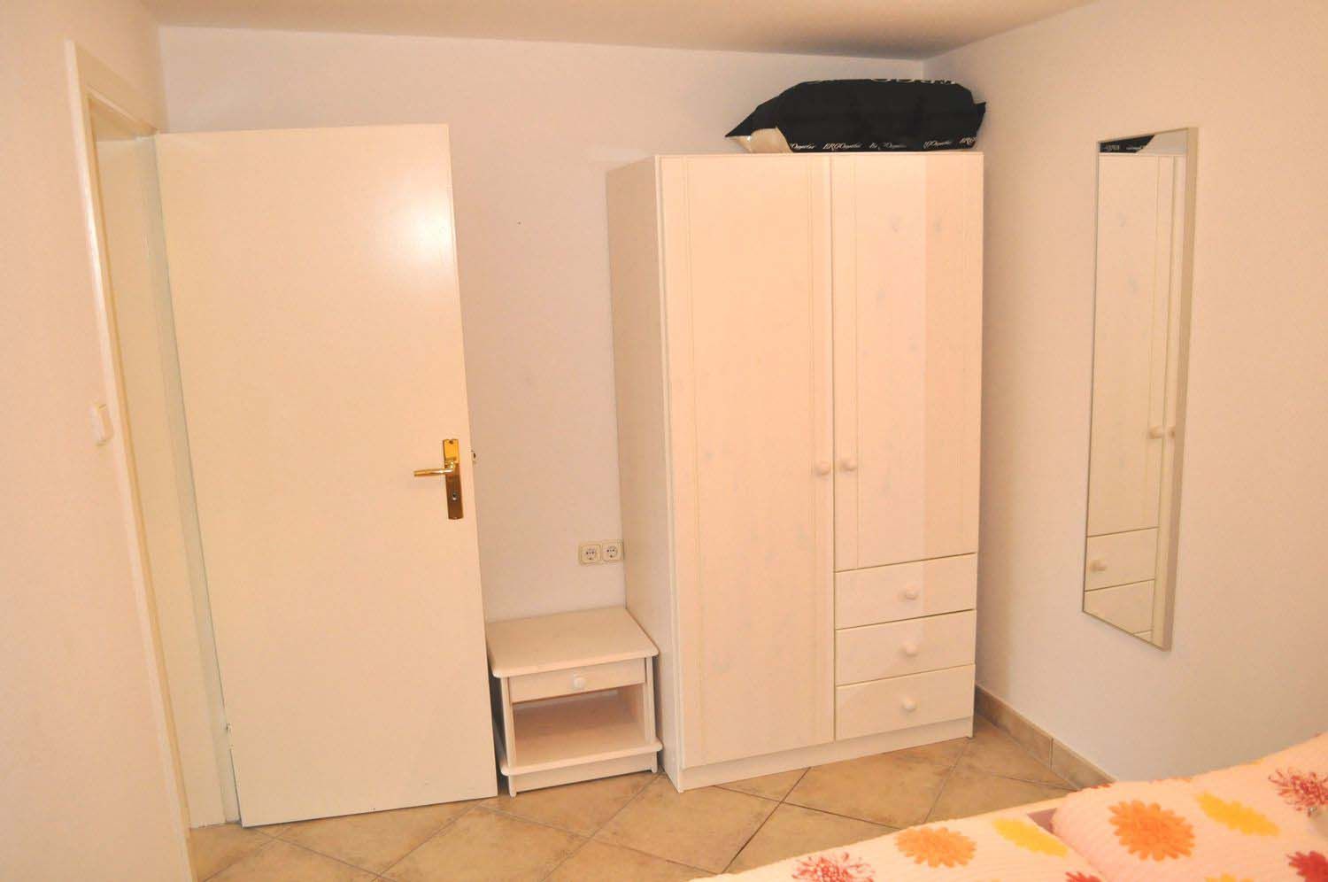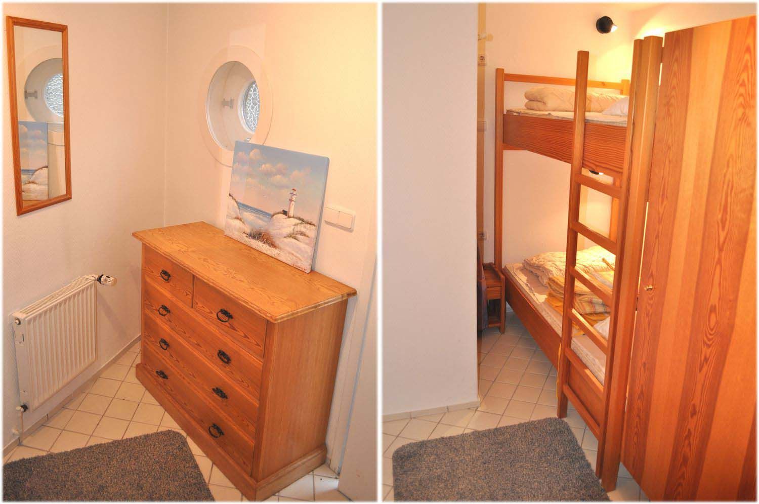 Schlafzimmer 3: Anrichte, Etagenbett, Kleiderhängeecke, Kleiderschrank, Nachttisch, Schlafzimmer ist nur von aussen zugänglich, Spiegel