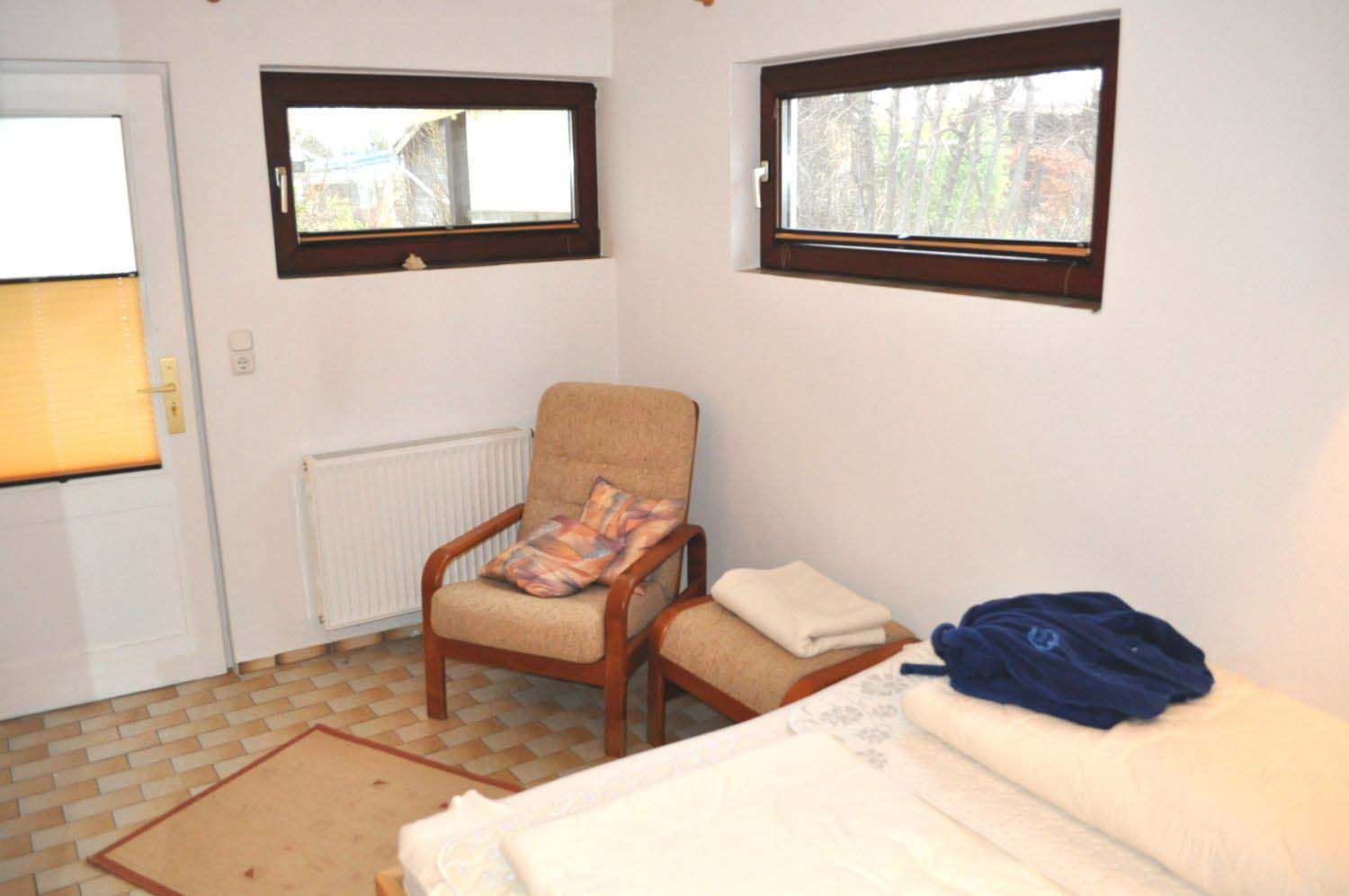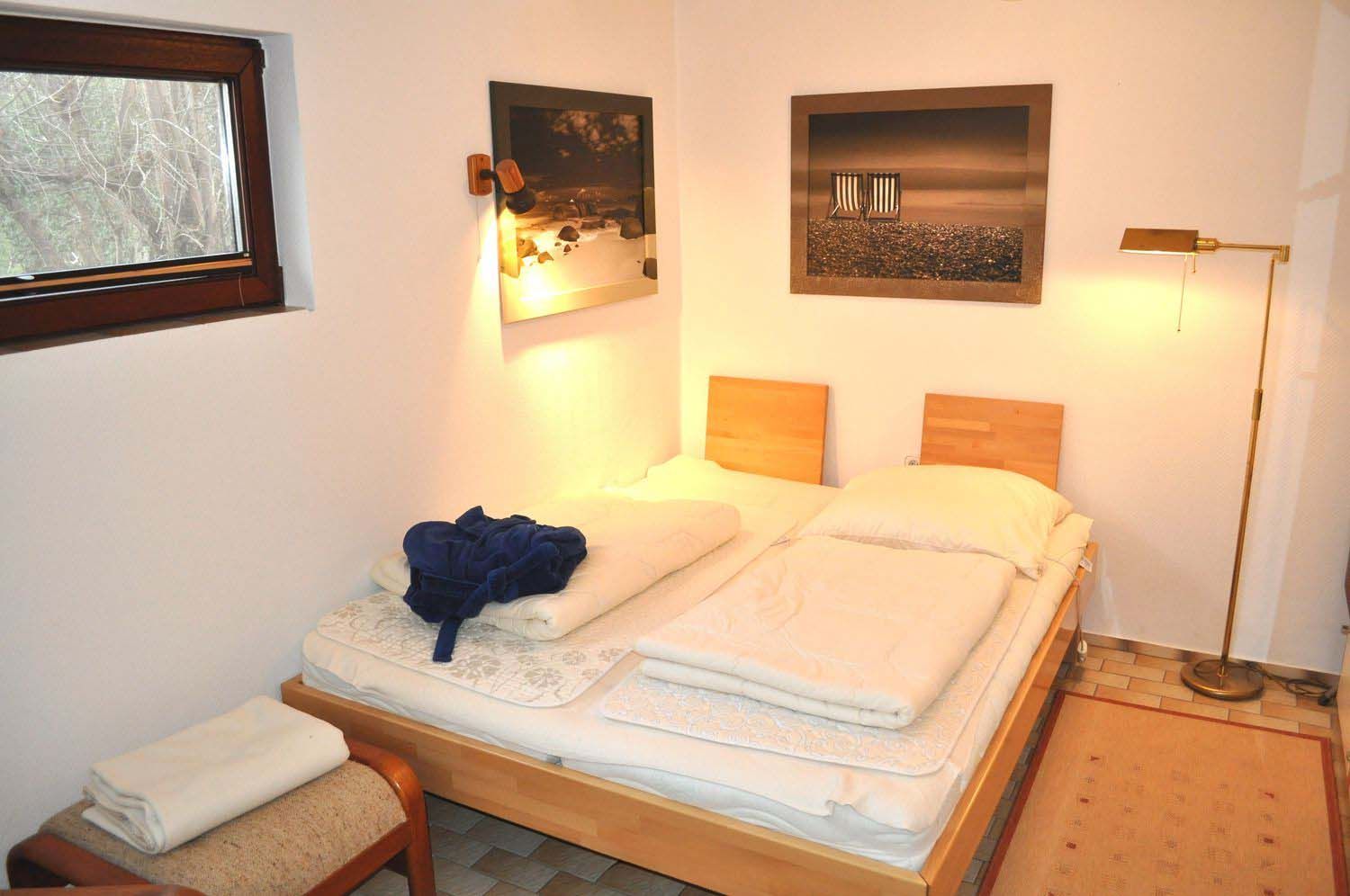 Schlafzimmer 2: Bügelbrett, Bügeleisen, Doppelbett 2,00 x 1,60 m, Hocker, Kleiderschrankregal, Salontür zum Gäste-WC, Schlafzimmer ist nur von aussen zugänglich, Sessel, Stehlampe