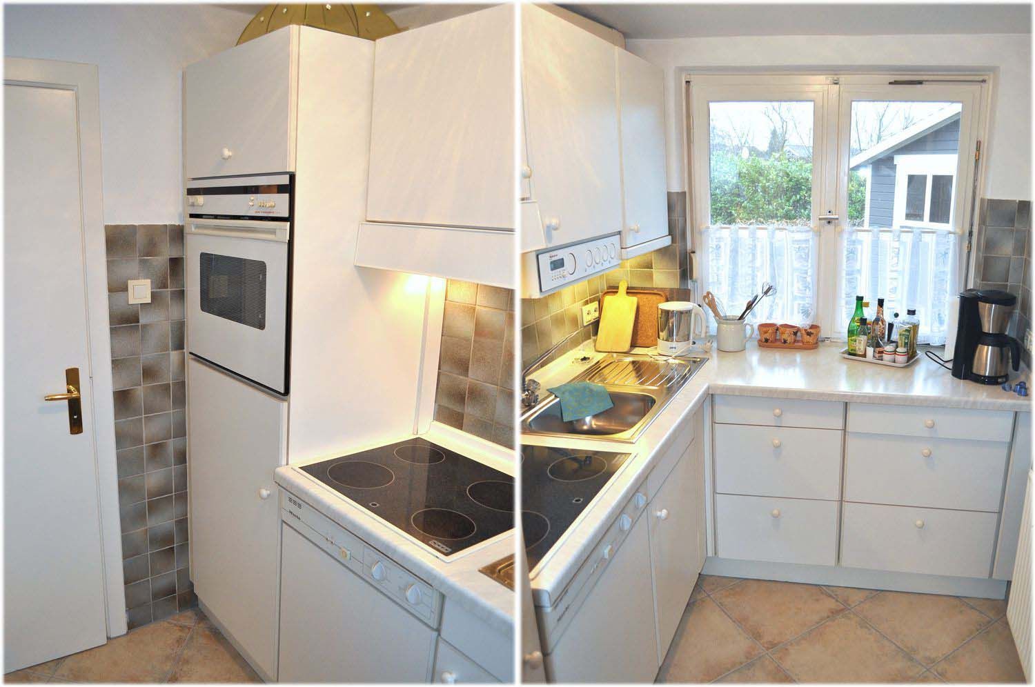 Küche: 4 Plattenherd mit Ceranfeld und Backofen, Dunstabzugshaube, Einbauküche, Geschirr, Handmixer, Kaffeemaschine, Kochtöpfe, Kühlschrank mit 3* Gefrierfach, Nespresso Maschine, Spülmaschine, Toaster, Wasserkocher