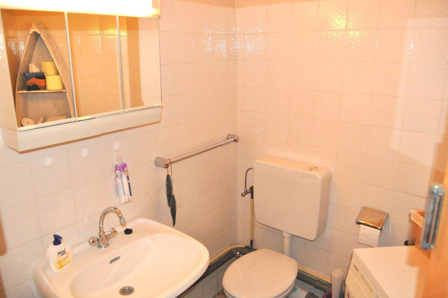 Bad 1: Dusche, Duschkabine, Duschklappsitz, Spiegelschrank, Waschbecken, WC
