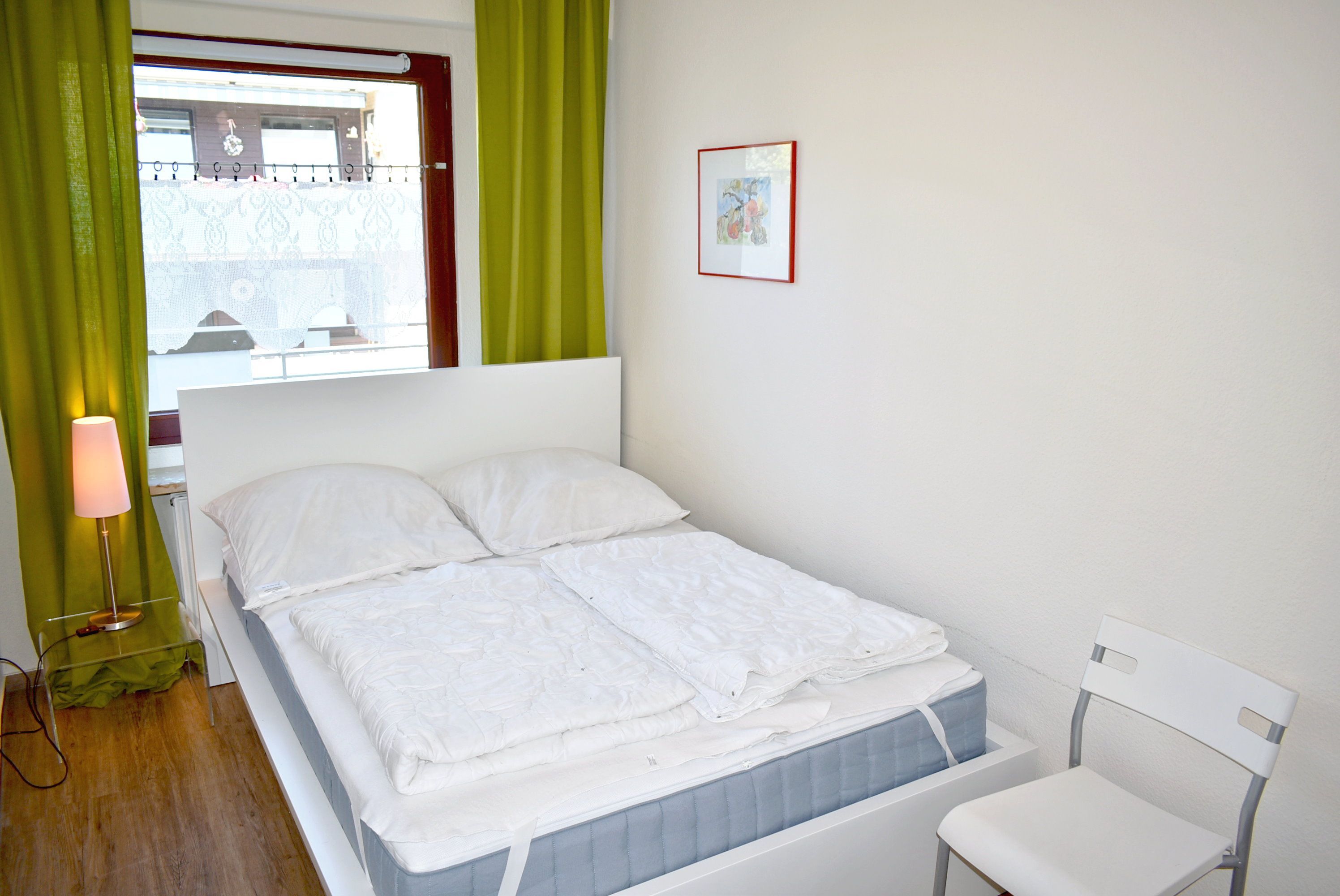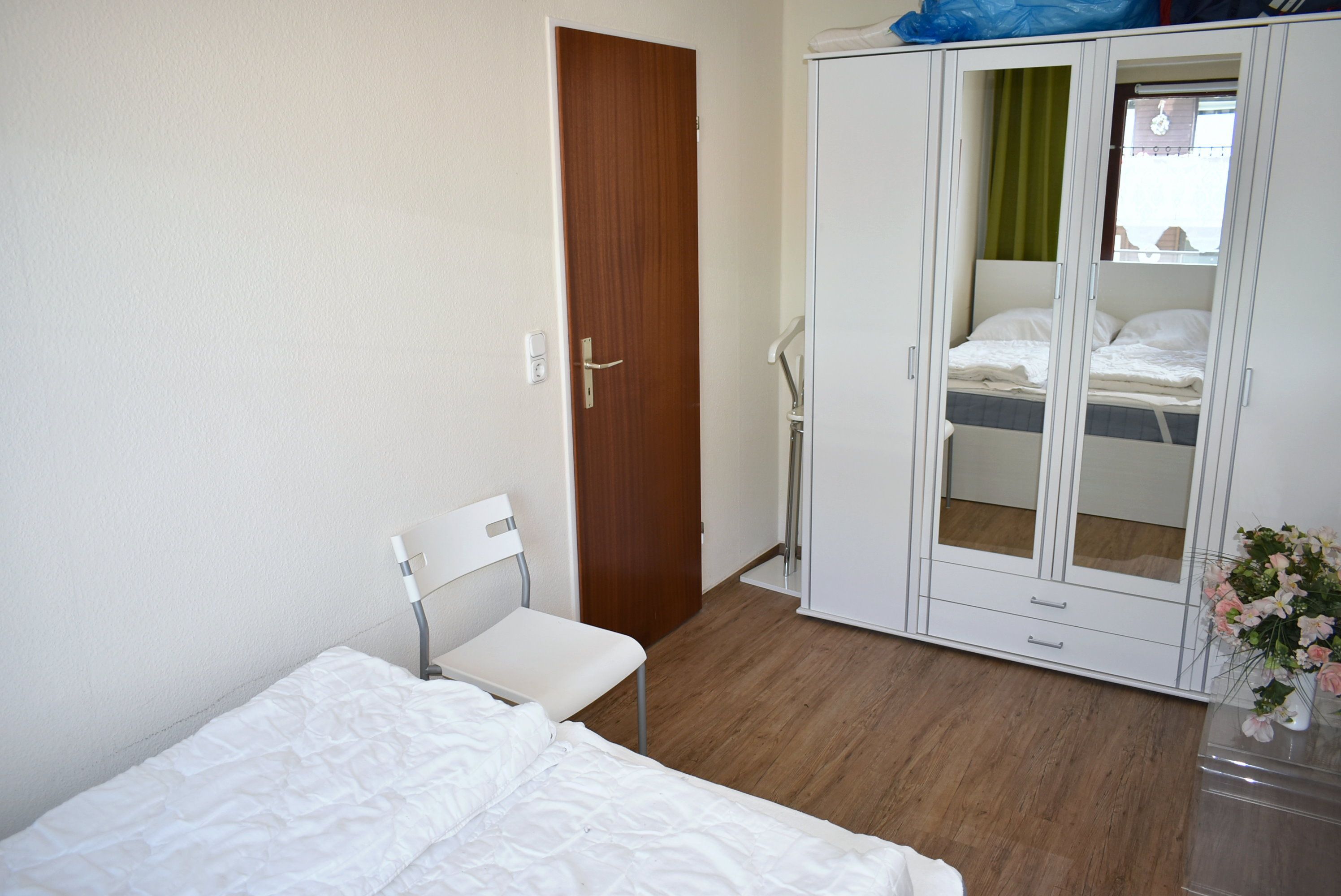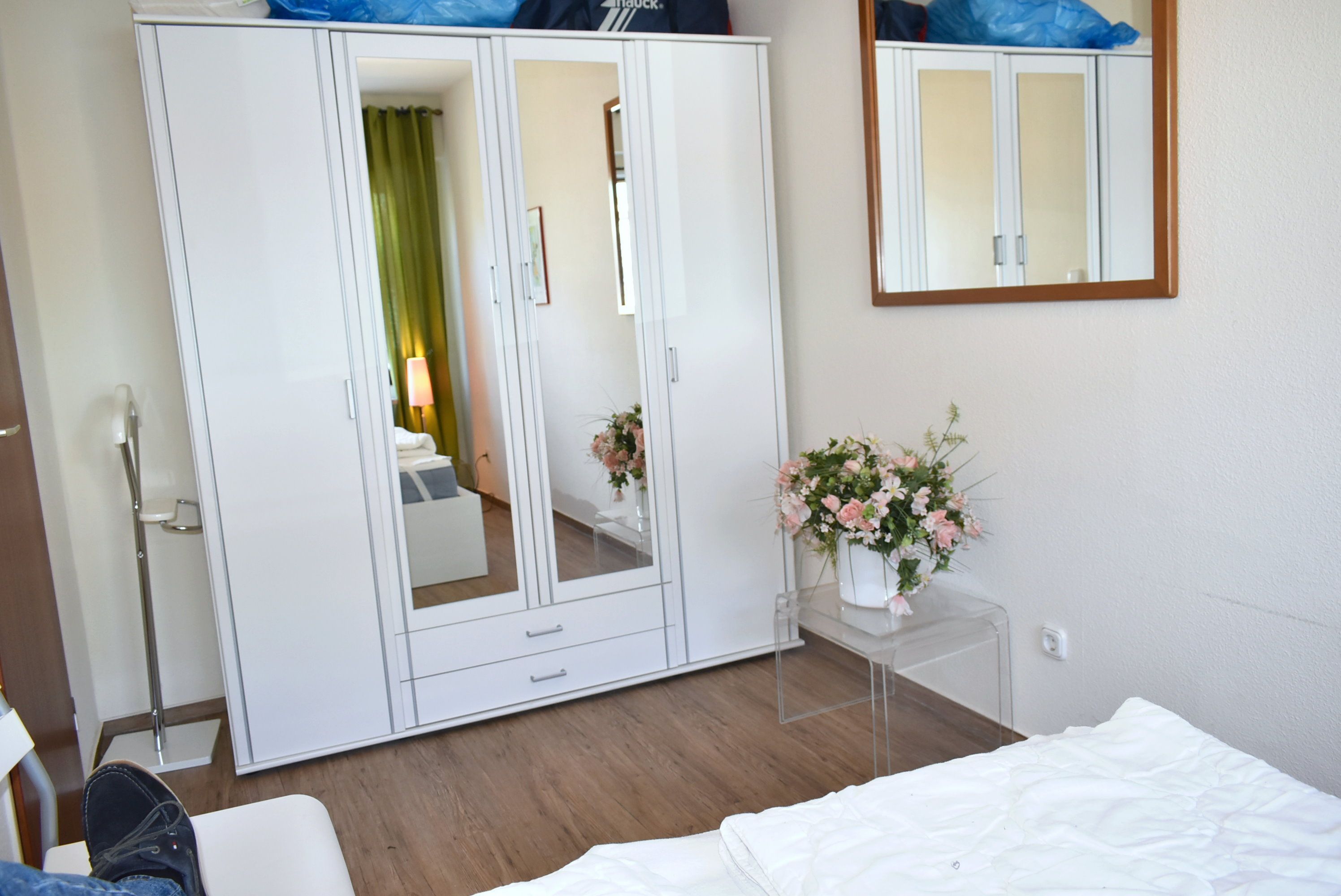 Schlafzimmer 1: 1 Doppelbett 2,00 x 1,40m, 1 Matratze 2,00 x 1,40 m, Spiegel, Tischlampe, Nachttisch, Beistelltisch, Kinderbett inkl., Kleiderschrank, Stuhl, Stummerdiener