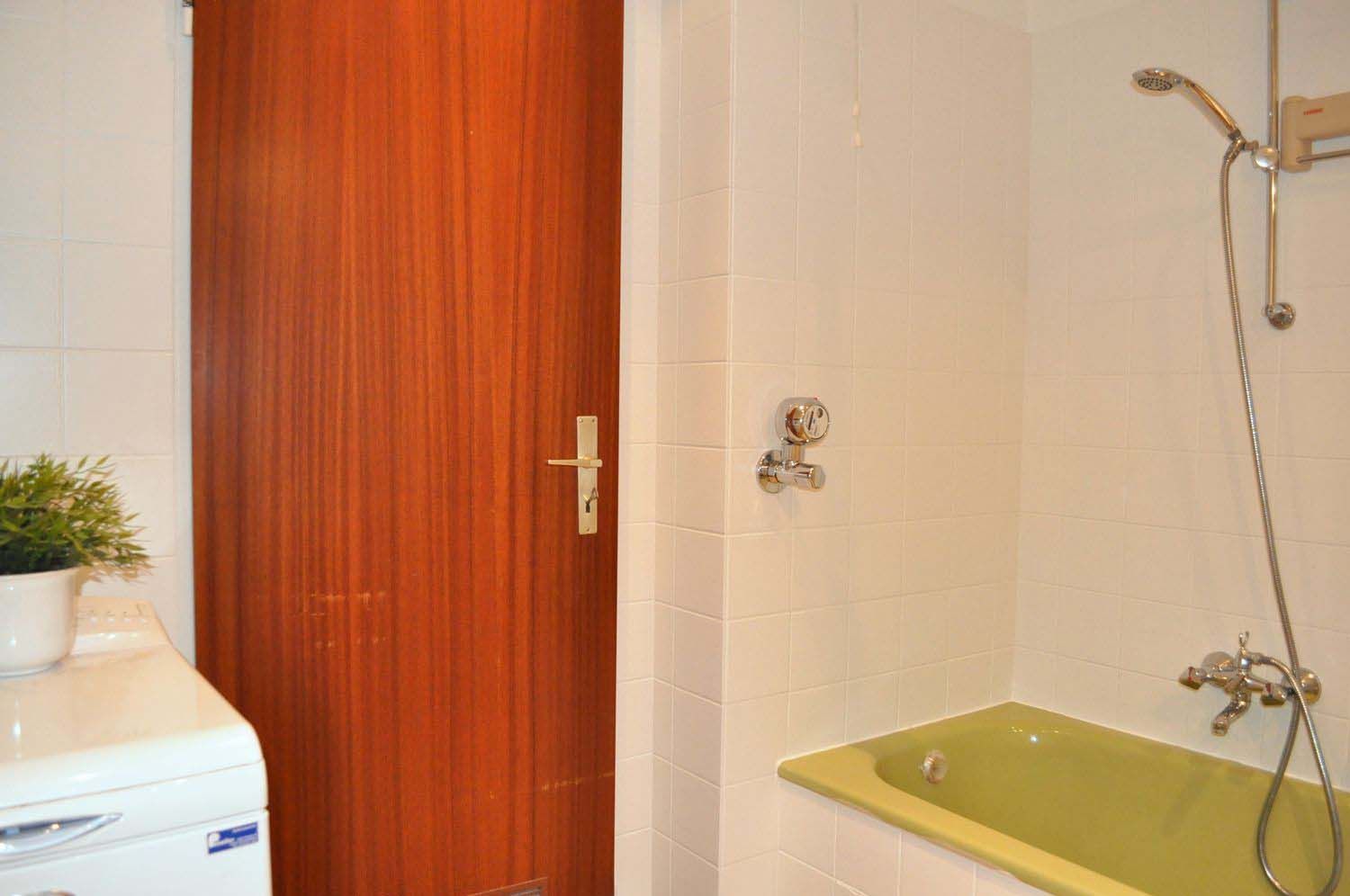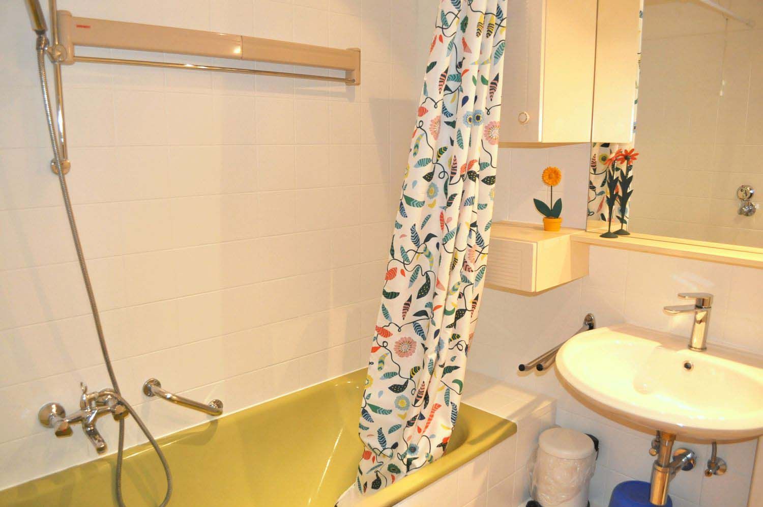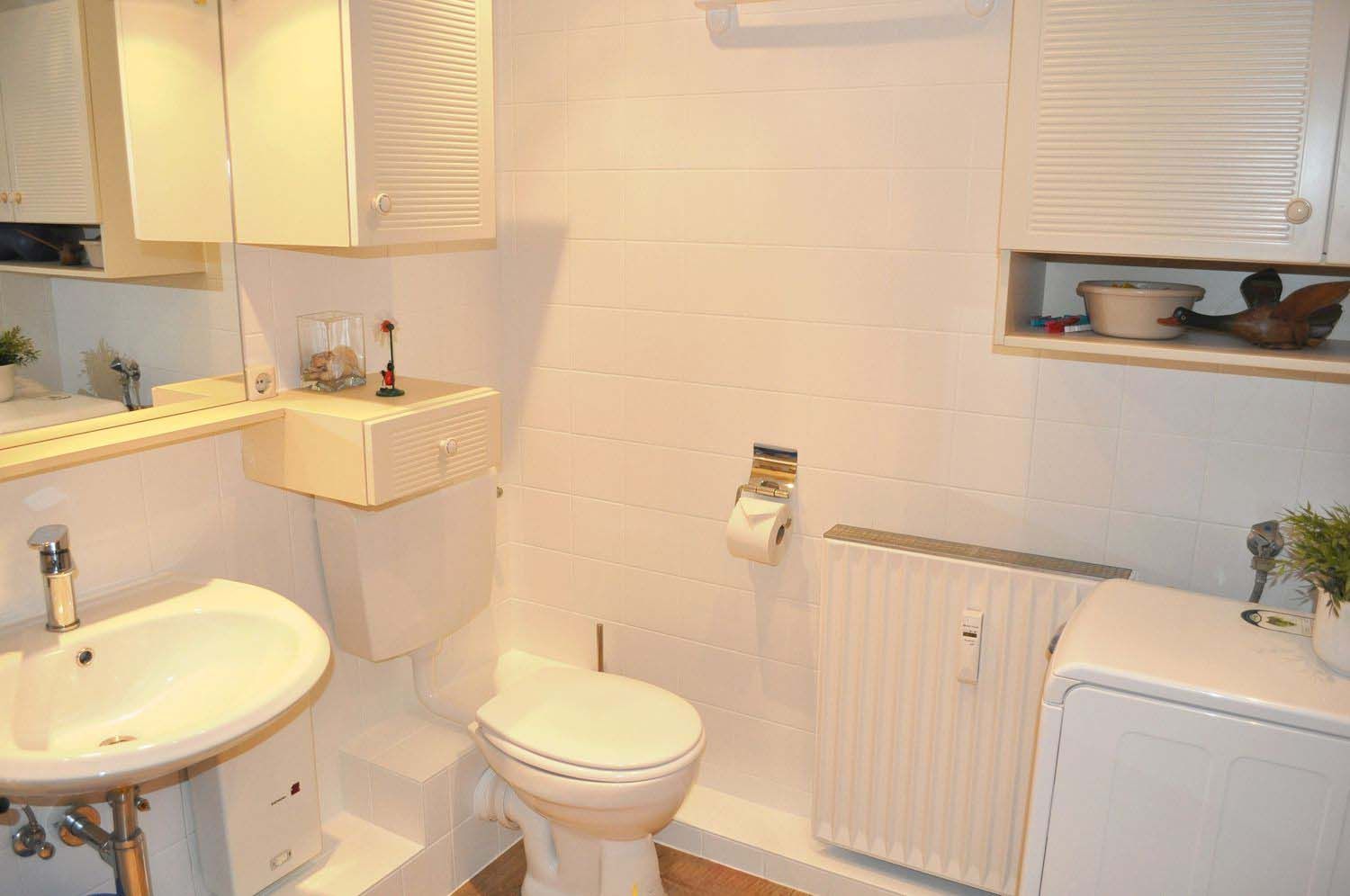 Bad 1: 2 Hocker, Badewanne, Fön, Handtuchständer, Spiegelschrank, Waschbecken, Waschmaschine, WC