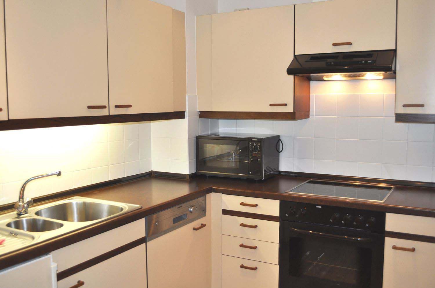 Küche: 4 Plattenherd mit Ceranfeld und Backofen, Bügeleisen, Dunstabzugshaube, Eierkocher, Einbauküche, Geschirr, Kaffeemaschine, Kochtöpfe, Kühlschrank mit 3* Gefrierfach, Mikrowelle, Spülmaschine, Toaster, Wasserkocher