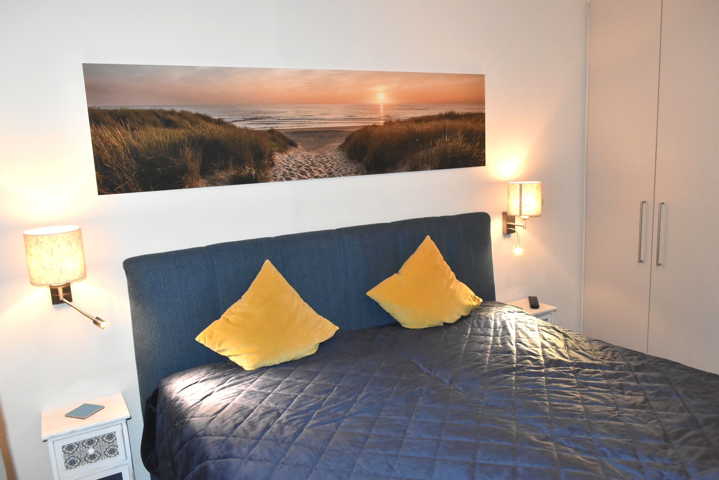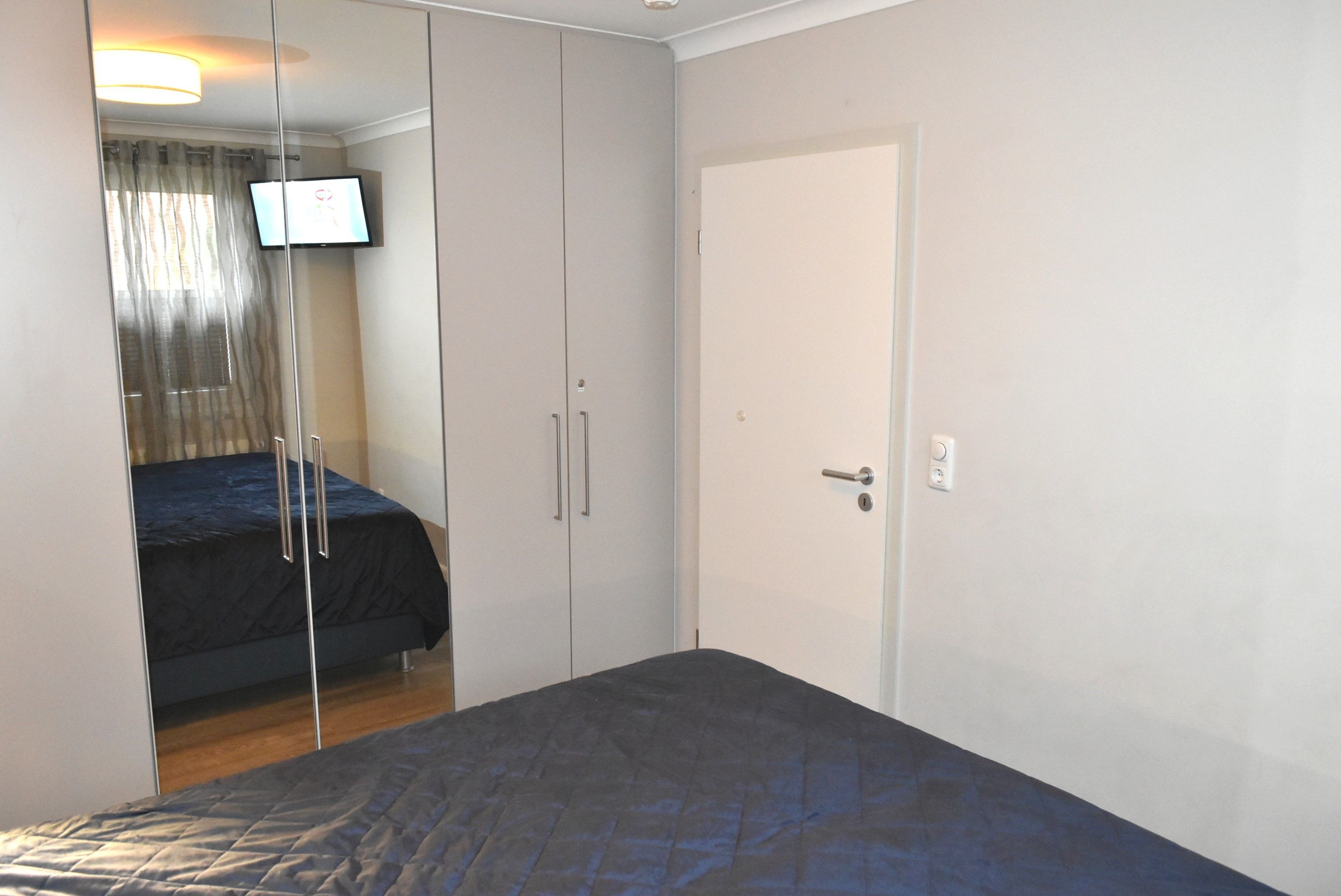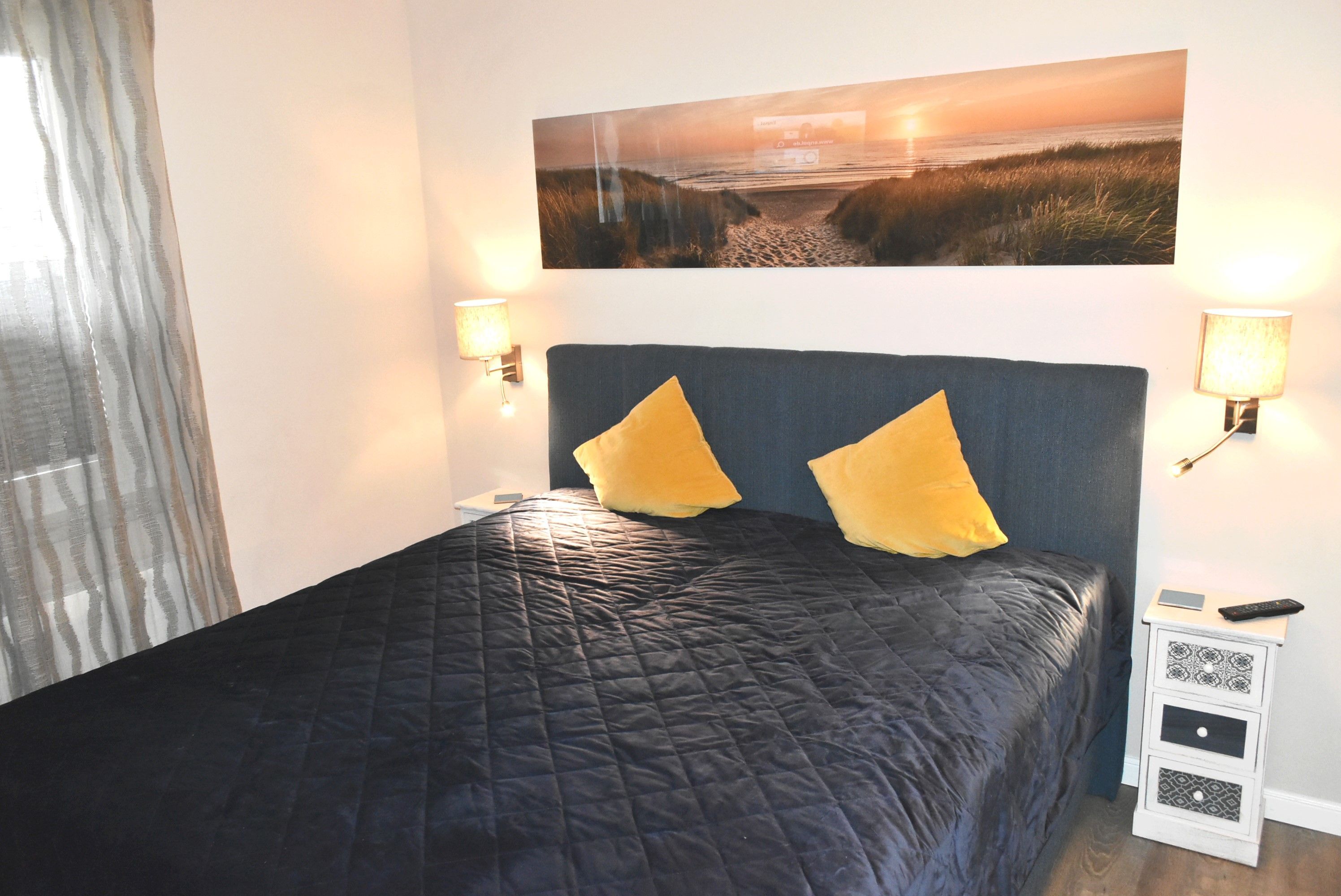 Schlafzimmer 1: 2 Nachttische, Boxspringbett 2,00 x 1,80 m, Flachbildschirm, Sat-TV, Schrank, Spiegel