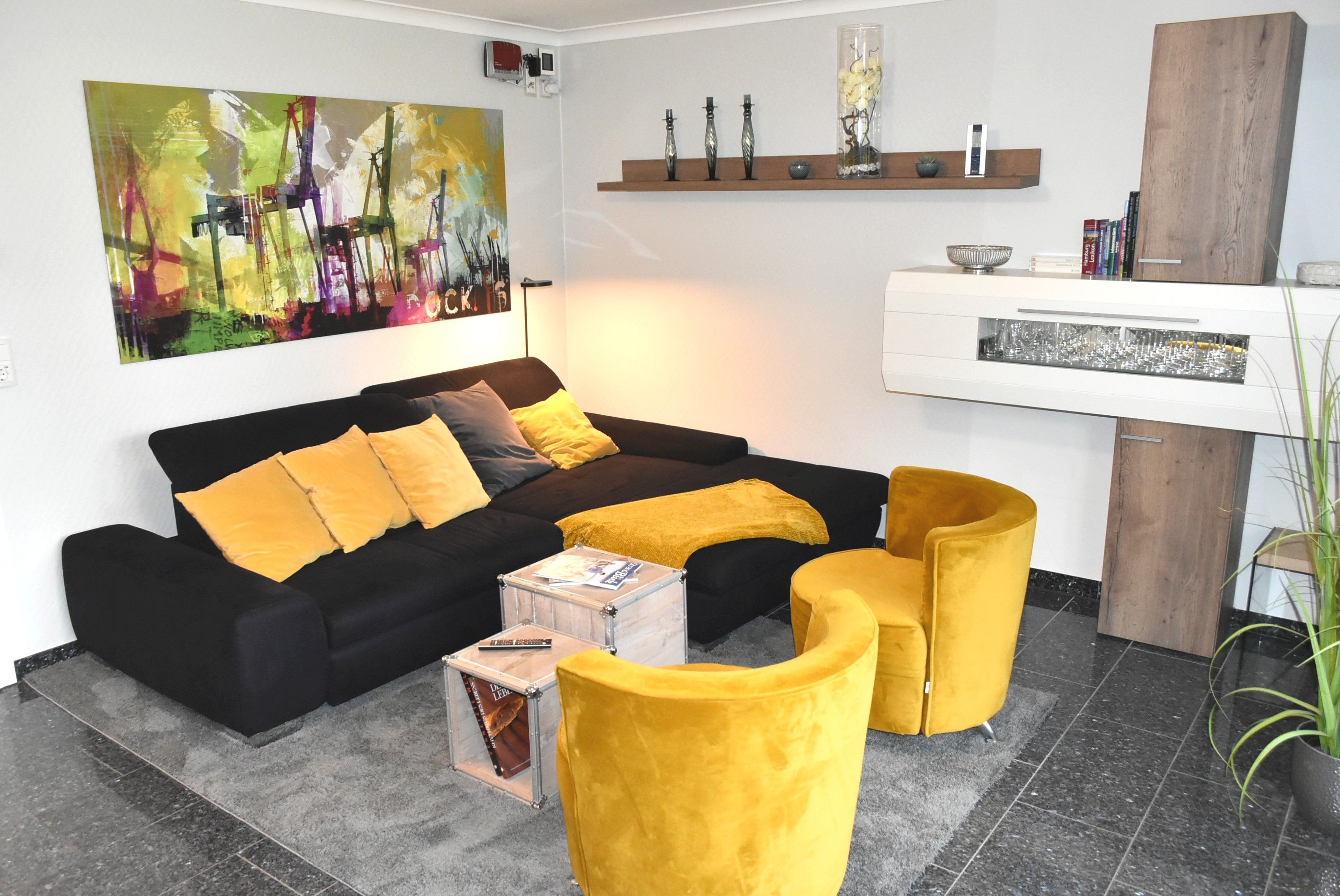 Wohnzimmer:   2 Sessel, 4 Plattenherd mit Ceranfeld und Backofen, 4 Stühle, Bügelbrett, Bügeleisen, Couchtisch, Doppelschlafcouch, DVD-Player, Einbauküche, Esstisch, Flachbildschirm, Geschirr, Kaffeemaschine, Kochtöpfe, Kofferradio mit CD-Player, Kühlschrank, Mikrowelle, Safe, Sat-TV, Spülmaschine, Stehlampe, Toaster, Video-Recorder, Vitrinenschrank, Wasserkocher