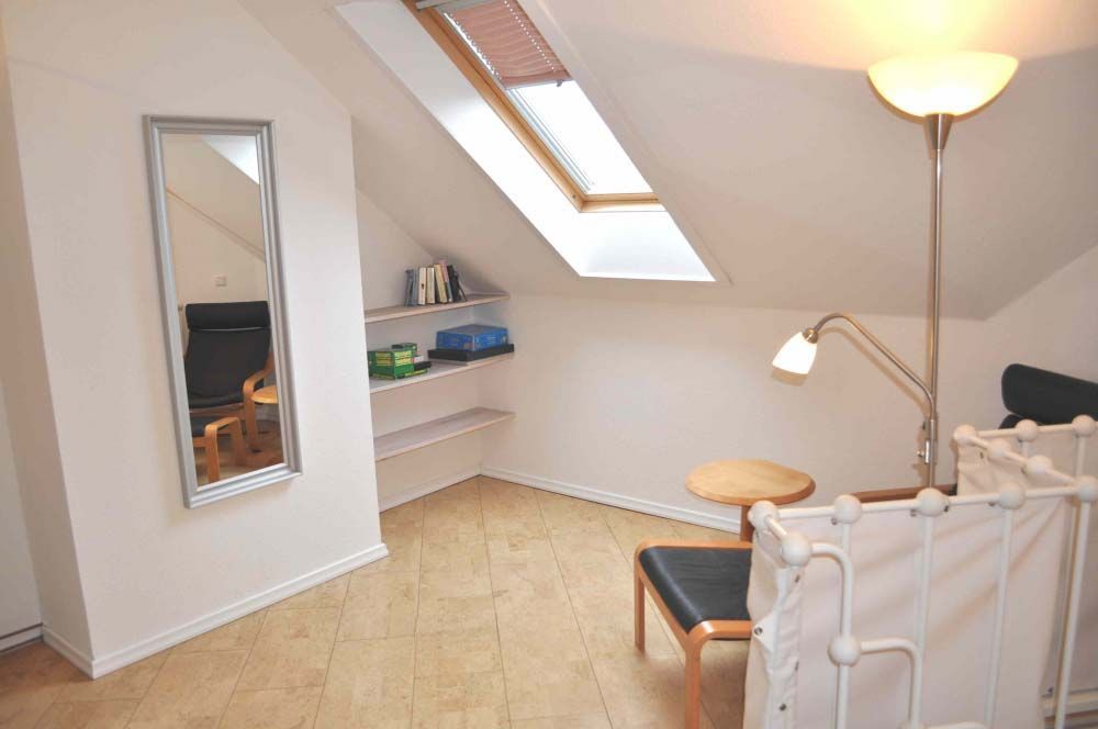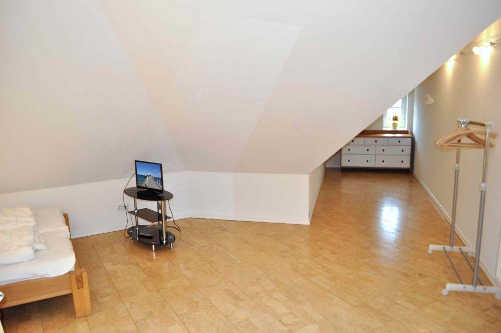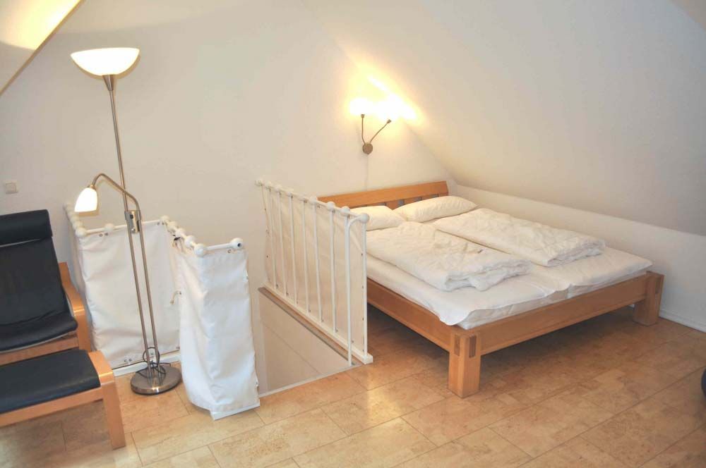 Schlafzimmer 2: Anrichte, Beistelltisch, Doppelbett 2,00 x 1,60 m, Flachbildschirm, Hocker, Kabel-TV, Kindersicherung am Geländer, Kleiderstange, Sessel, Stehlampe, Treppe nach unten, TV-Rolltisch