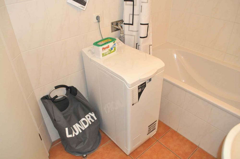 Bad 1: kleiner Schrank, Spiegel, Wanne, Waschbecken, Waschmaschine, WC