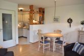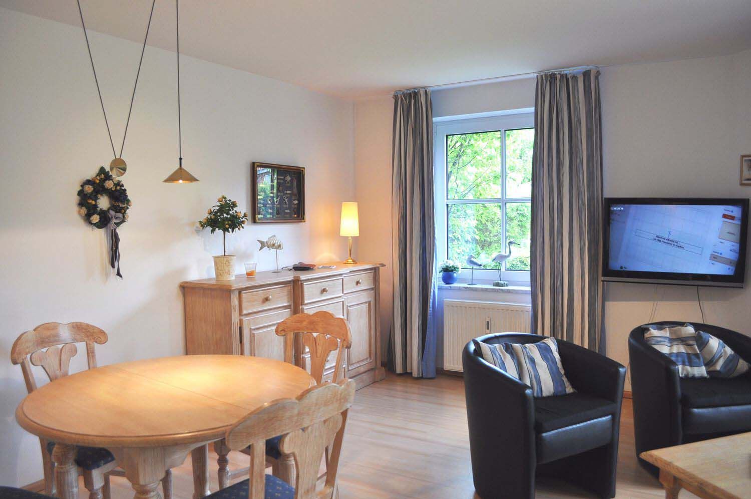 Wohnzimmer: 2 Sessel, 4 Stühle, Anrichte, Couchtisch, Einbauküche, Esstisch, Flachbildschirm, Geschirr, Kaffeemaschine, Kochtöpfe, Mikrowelle, Sat-TV, Schlafcouch, Spülmaschine, Stehlampe, Tischlampe, Toaster, Wasserkocher