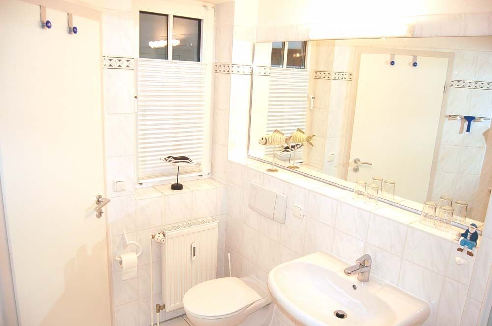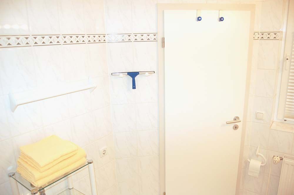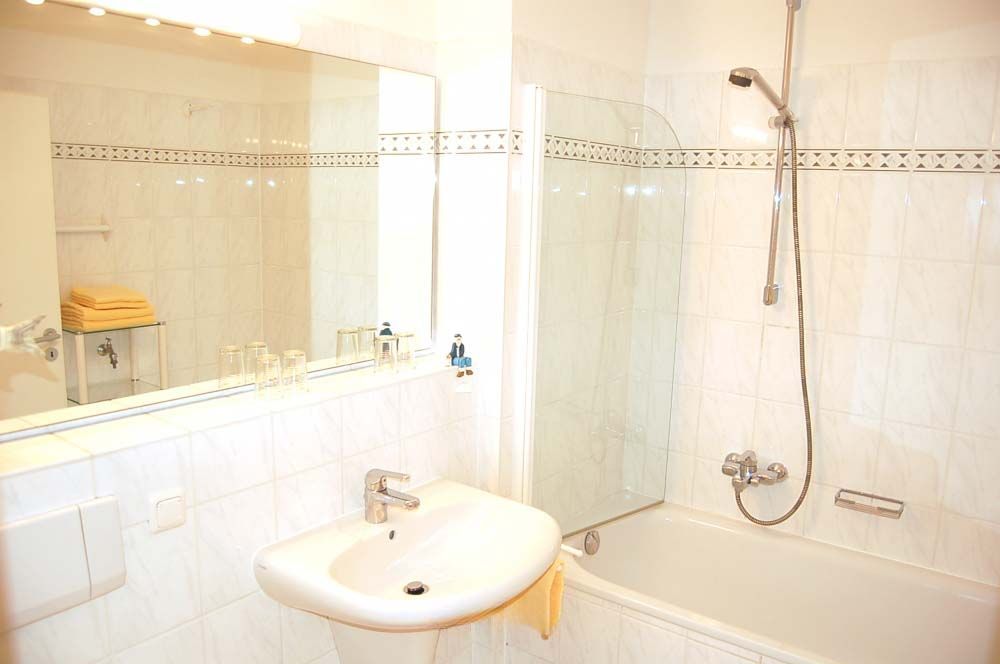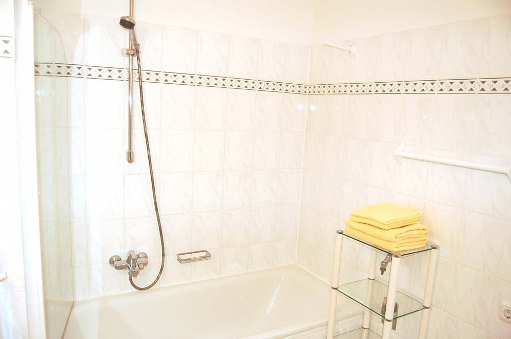 Bad 1: Badewanne, Duschwand, Waschbecken, WC