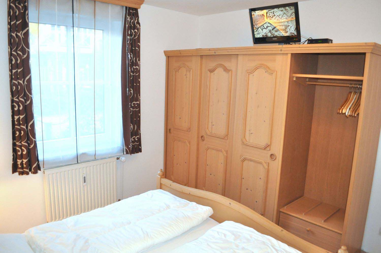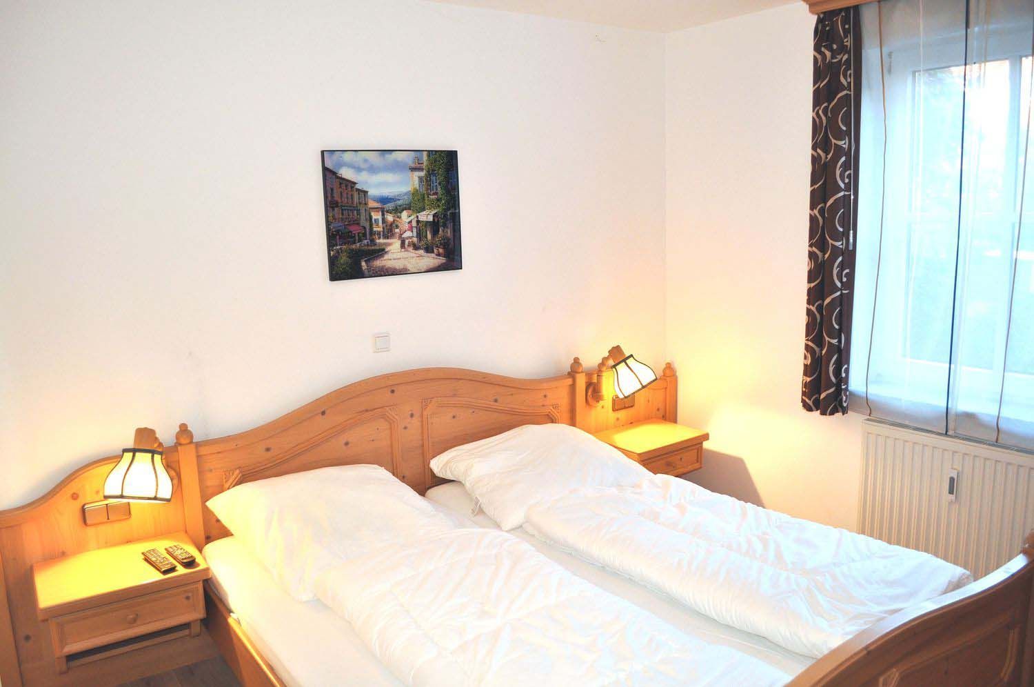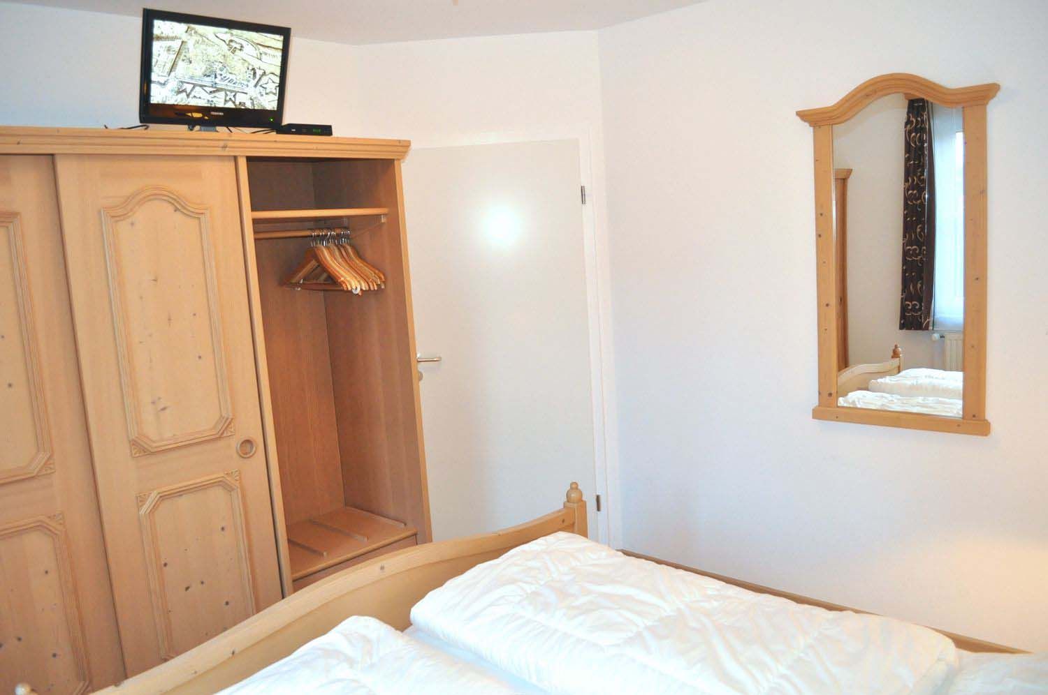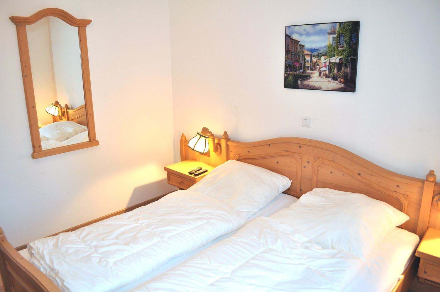 Schlafzimmer 1: 2 Matratzen, 2 Nachttische, 2 Nachttischlampen, Doppelbett 2,00 x 1,80 m, Flachbildschirm, Kleiderschrank, Sat-TV, Spiegel, Verdunklungsstores