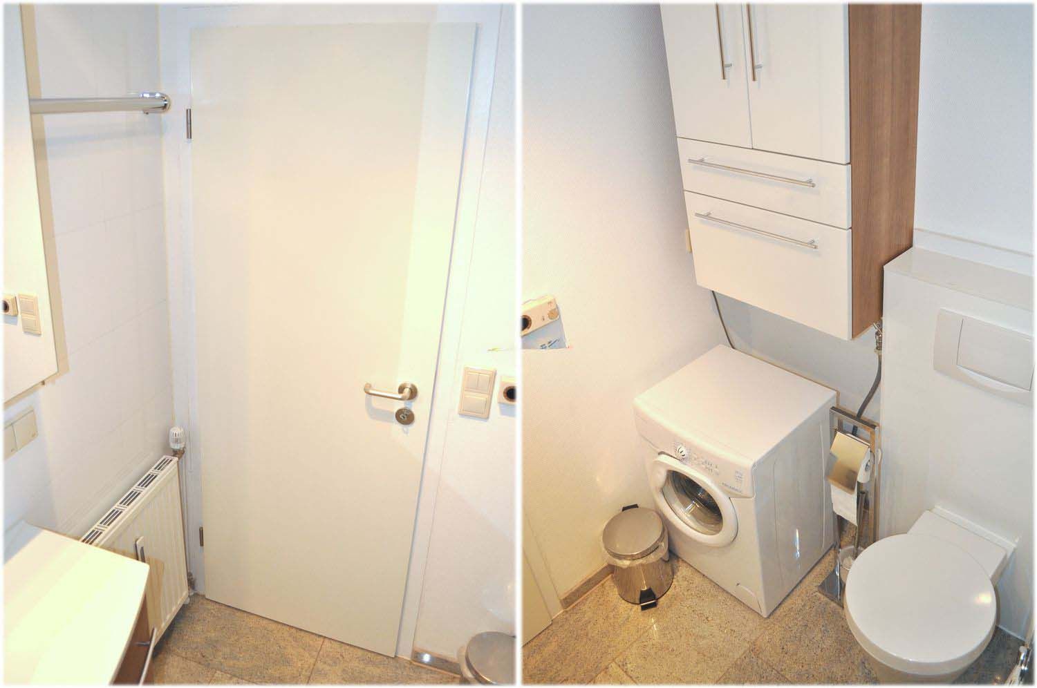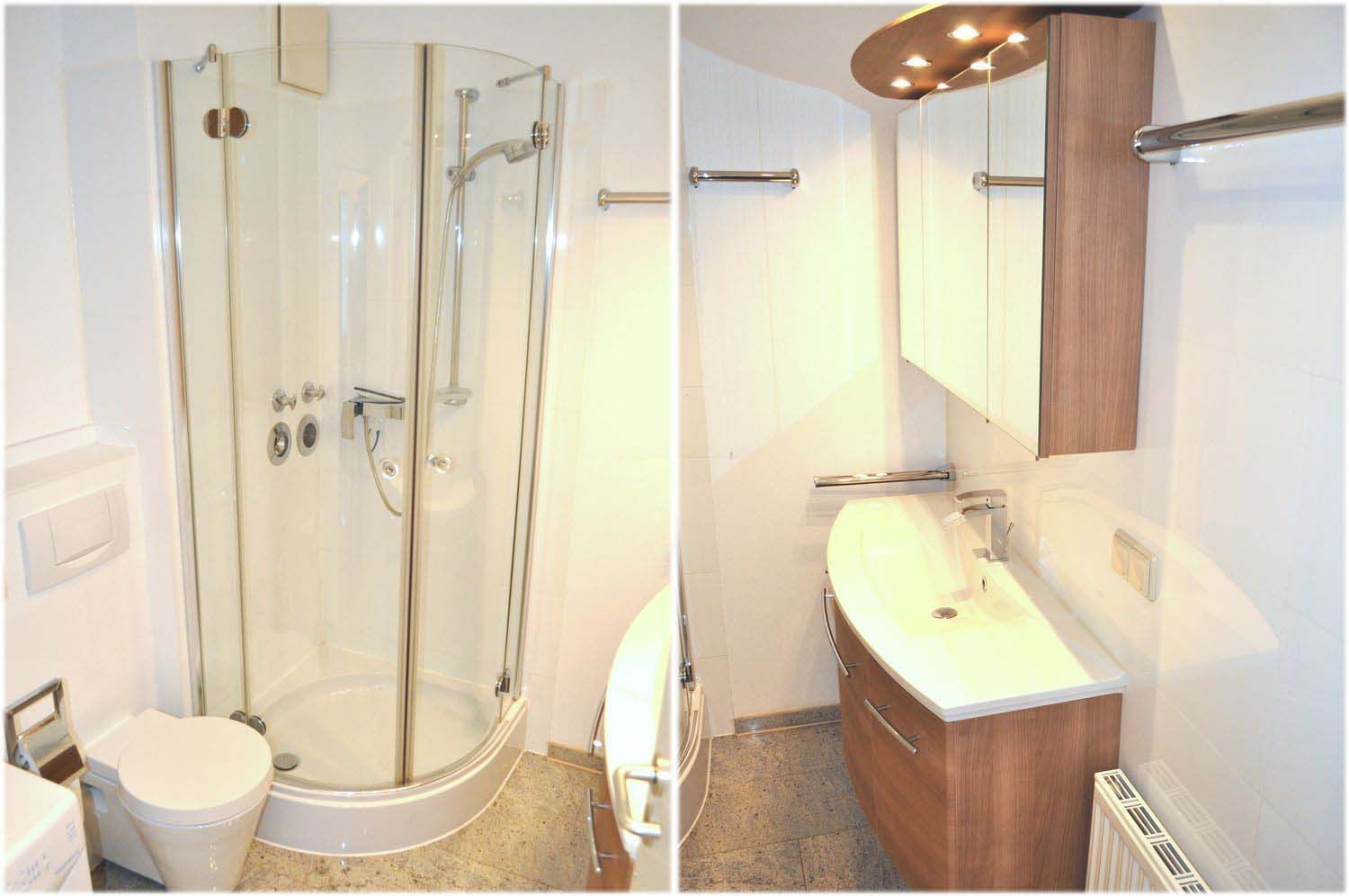 Bad 1: Dusche, Duschkabine, Fön, Hängeschrank, Spiegelschrank, Waschmaschine, Waschtisch mit Unterschrank, WC