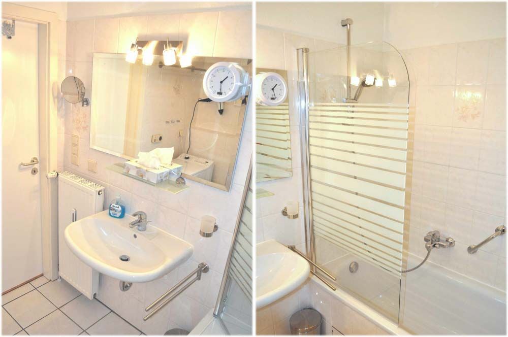 Bad 1: Dusche, Fön, Kosmetikspiegel, Radio, Spiegel, Waschbecken, WC