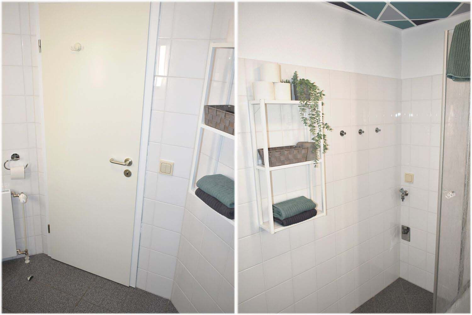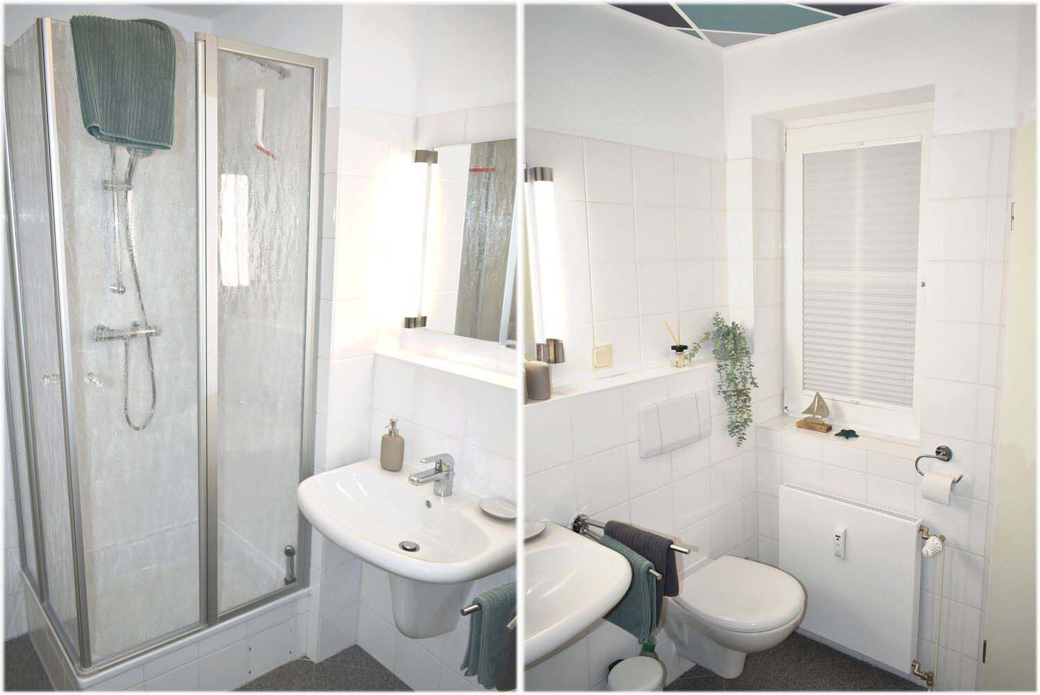 Bad 1: Dusche, Duschkabine, Fön, Hängeregal, Spiegel, Waschbecken, WC