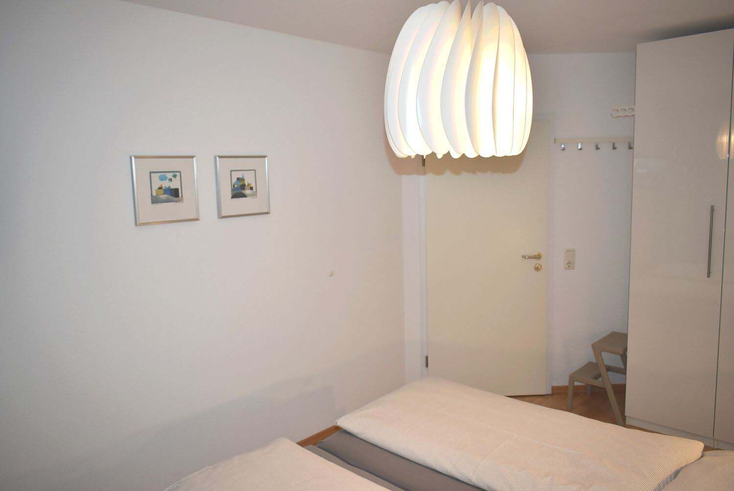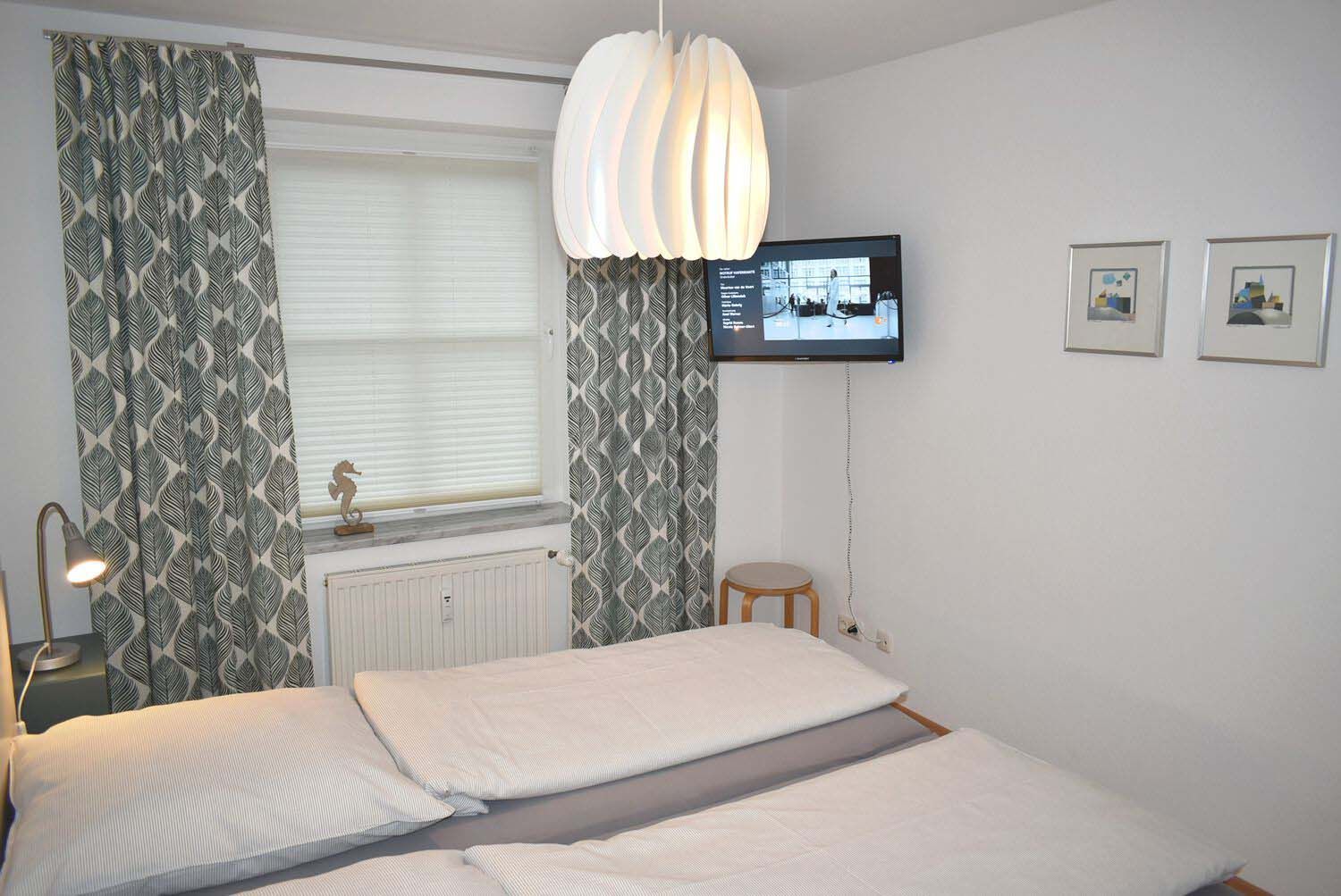 Schlafzimmer 1: 2 Matratzen, 2 Nachttische, 2 Nachttischlampen, Doppelbett 2,00 x 1,80 m, Flachbildschirm, Hakenleiste, Hocker, Kabel-TV, Kleiderschrank, Radiowecker, Tritt