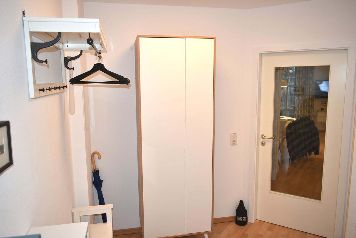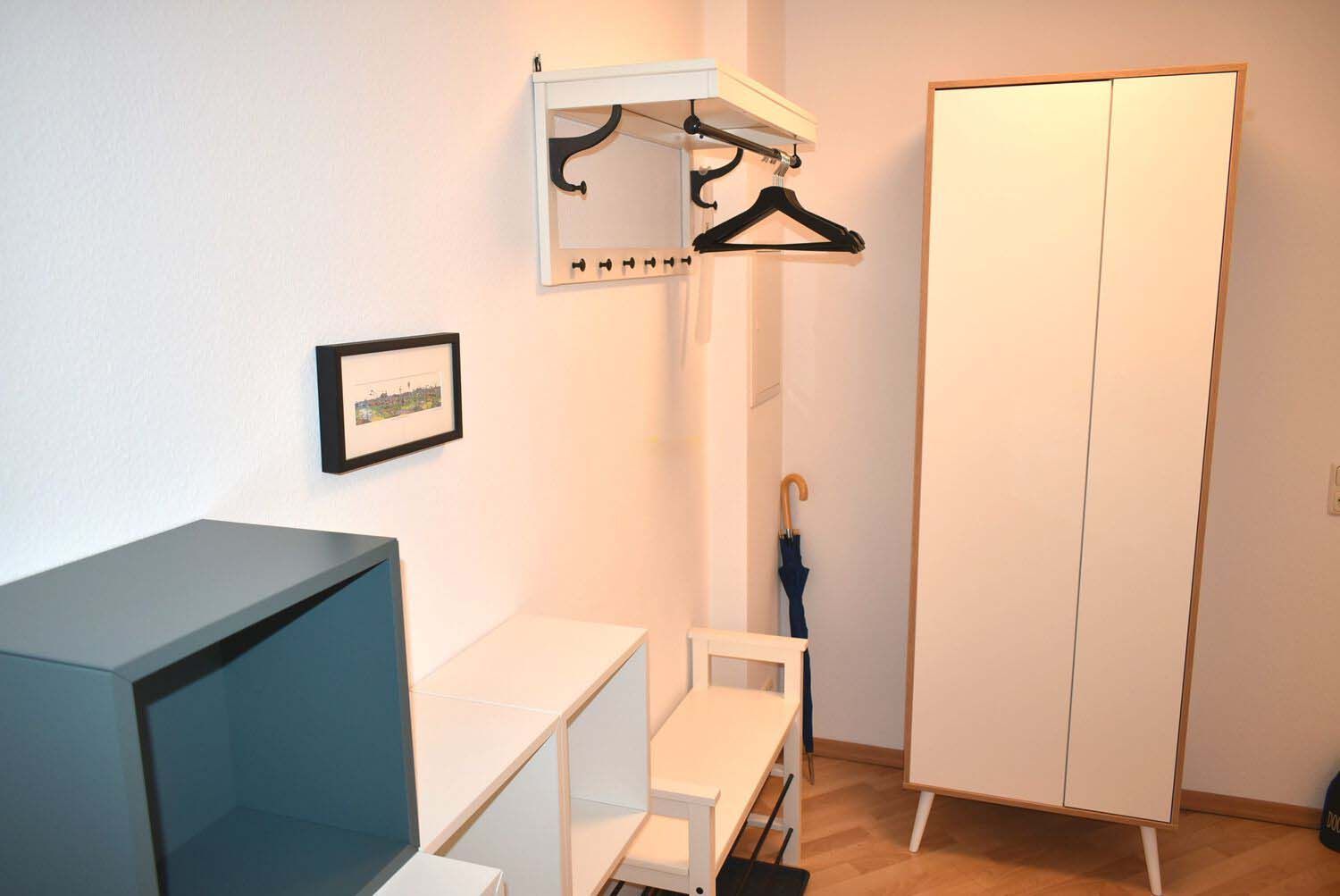 Flur: Garderobe, Regale, Schrank, Schuhständer, Spiegel, Staubsauger, Wäscheständer