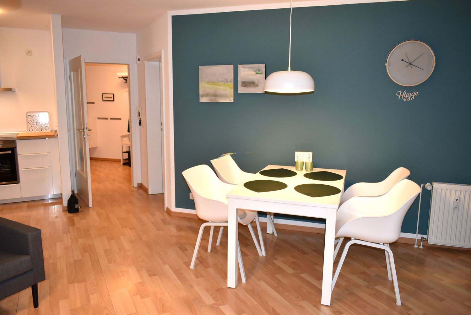 Wohnzimmer: 2 Couchtische, 4 Plattenherd mit Ceranfeld und Backofen, 4 Stühle, Dunstabzugshaube, DVD-Player, Eckschlafcouch 2,00 x 1,40 m, Einbauküche, Esstisch, Flachbildschirm, Gefrierschrank, Handmixer, Hängeregal, Hängeschrank, Kabel-TV, Kaffeemaschine, Küchenschrank, Mikrowelle, Radio mit USB und SD-Card, Sessel, Spülmaschine, Stabmixer, Stehlampe, Toaster, Wasserkocher, WLAN Lautsprecher