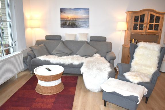 Die gemütliche Sitzgarnitur im Wohnbereich kann bei Bedarf als Schlafgelegenheit genutzt werden (Liegefläche ca. 2,00 * 1,25m). Das helle Badezimmer, mit einer Regen-Dusche, rundet die schöne Ferienwohnung ab.