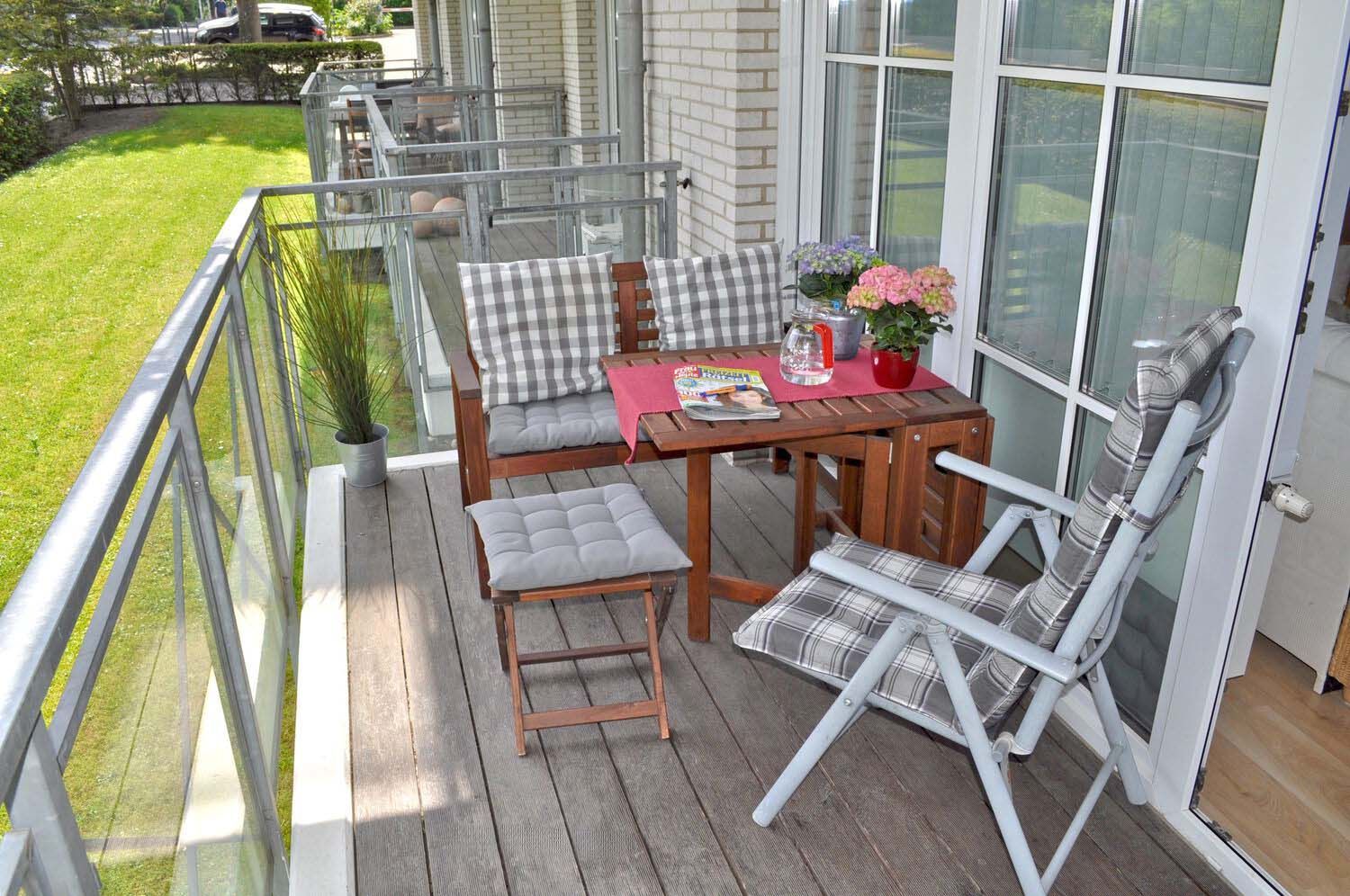 Balkon: 2 Stühle, Hocker, Nord- Ostlage, Tisch, überdacht, Wäscheständer