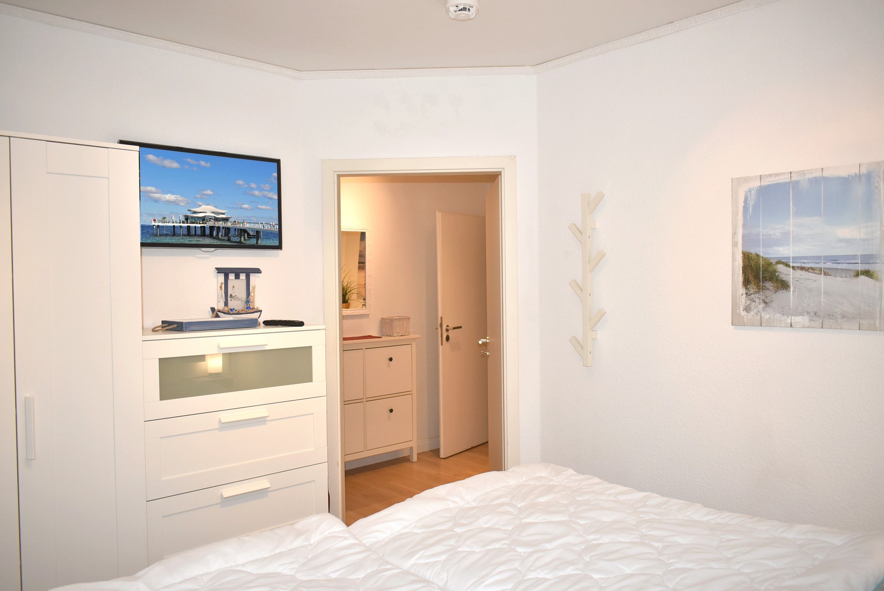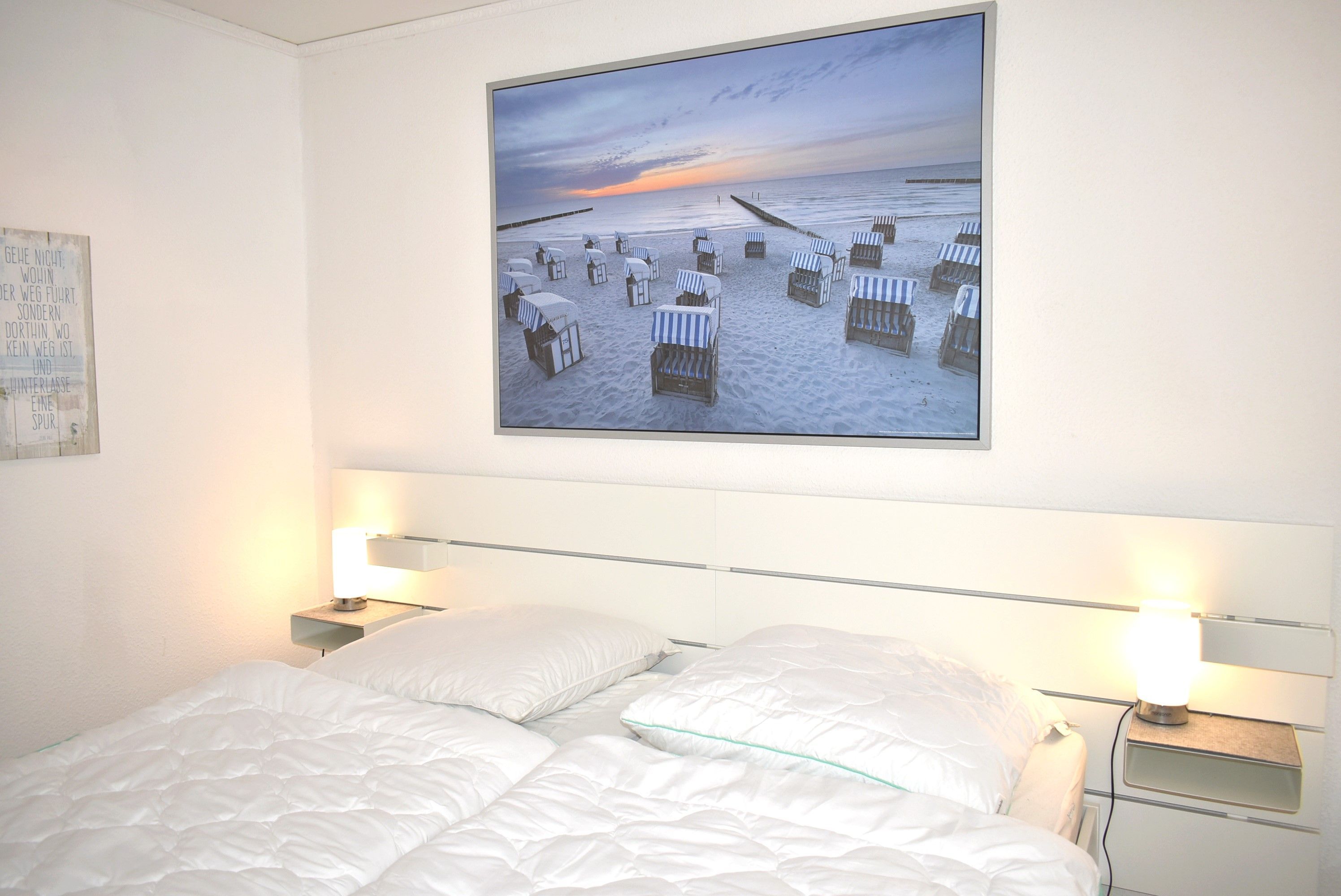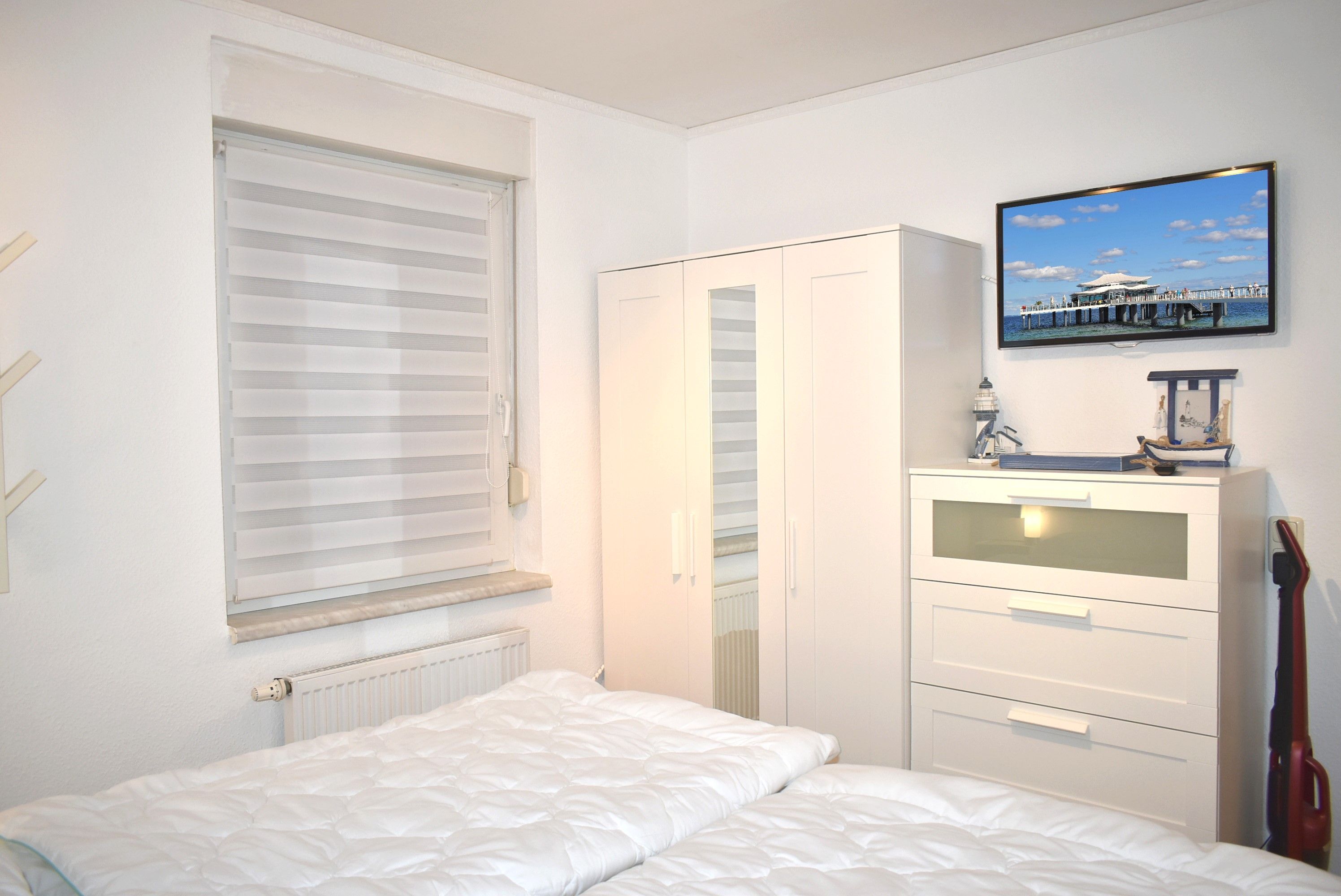 Schlafzimmer 1: 2 Matratzen, Doppelbett 2,00 x 1,80 m, Flachbildschirm, Kabel-TV, Kleiderschrank, Rollladen, Spiegel