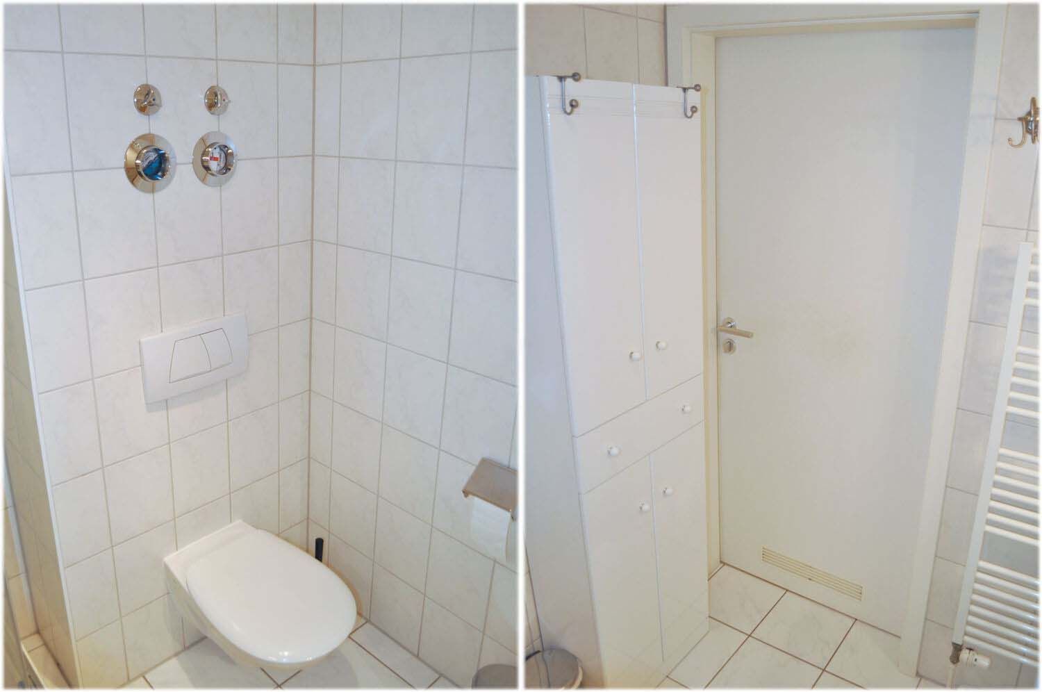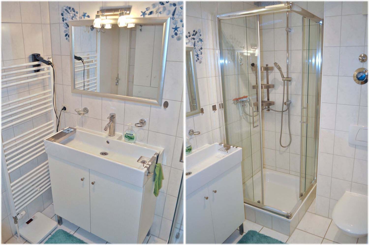 Bad 1: Dusche, Fön, Regendusche, Schrank, Spiegel, Waschtisch, WC