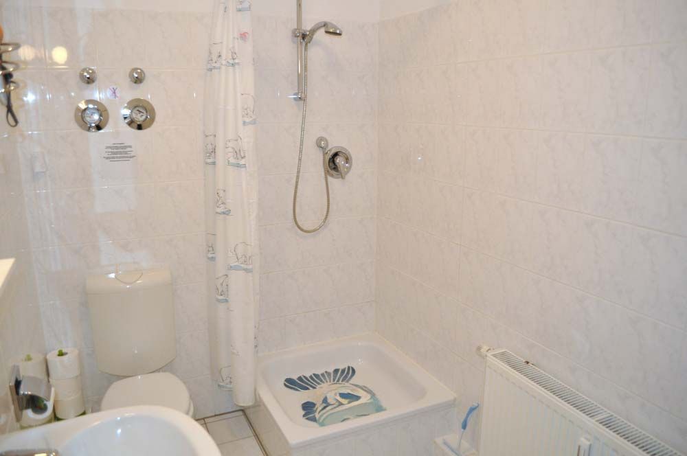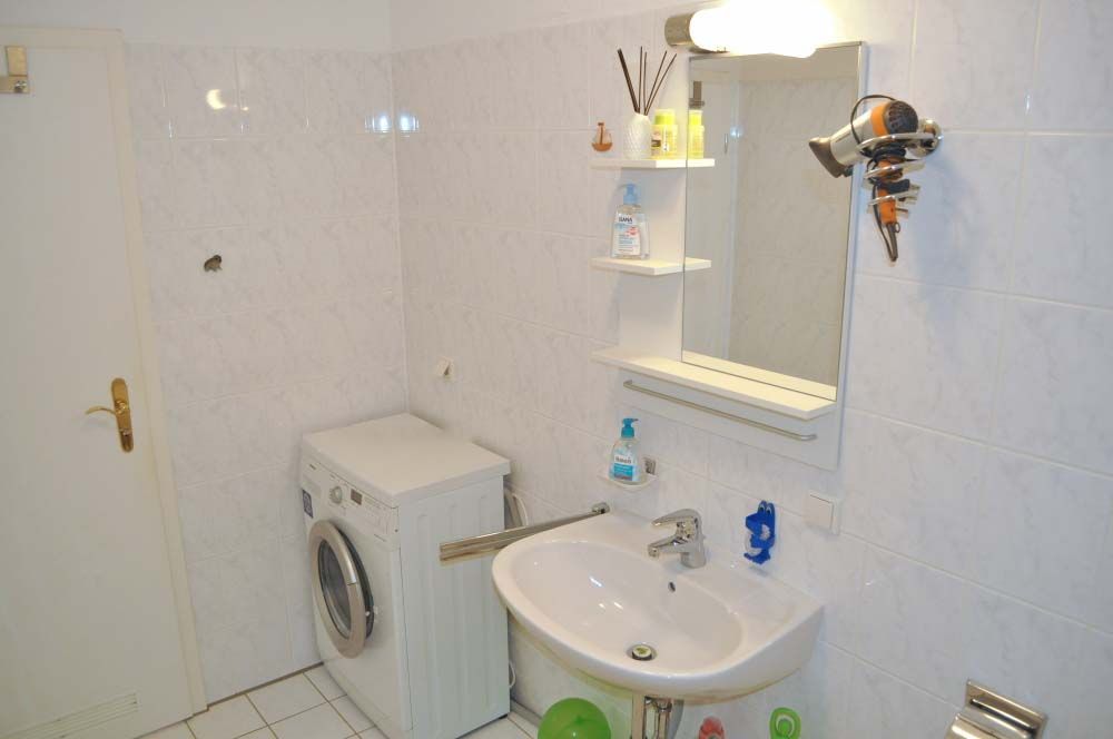 Bad 1: Dusche, Fön, Hocker, Spiegel, Waschbecken, Wäschewanne, Waschmaschine, WC