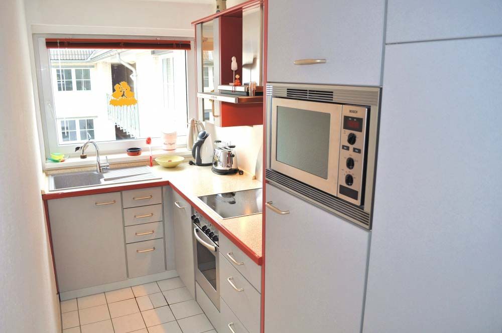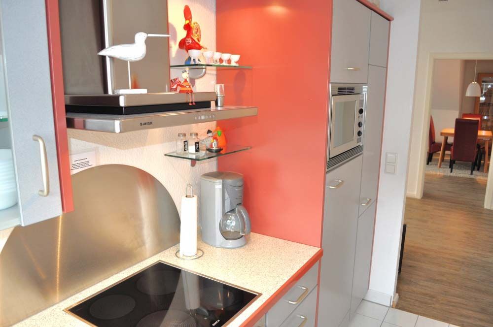 Küche: 4 Plattenherd mit Ceranfeld und Backofen, Dunstabzugshaube, E-Grill, Einbauküche, Geschirr, Handmixer, Kaffeemaschine, Kochtöpfe, Kühlschrank mit 3* Gefrierfach, Mikrowelle, Spülmaschine, Toaster, Wasserkocher