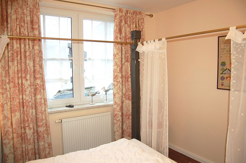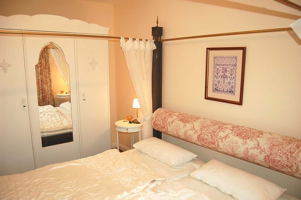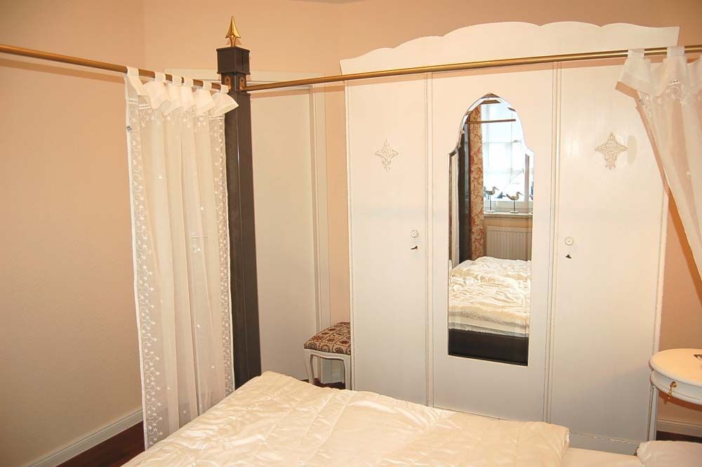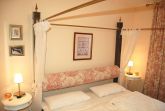 Schlafzimmer 1: 2 Nachttische, Himmeldoppelbett, Hocker, Parkettboden, Spiegelschrank, Stuhl