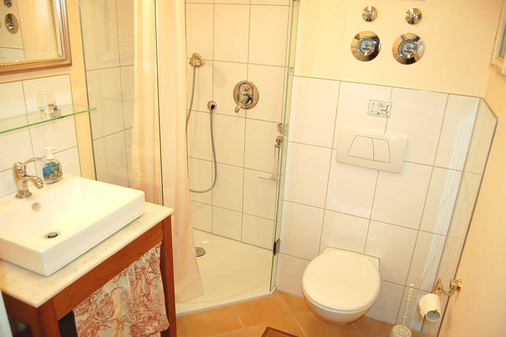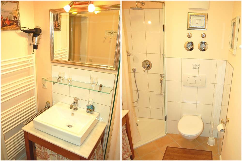 Bad 1: Dusche, Fön, Waschtisch, WC