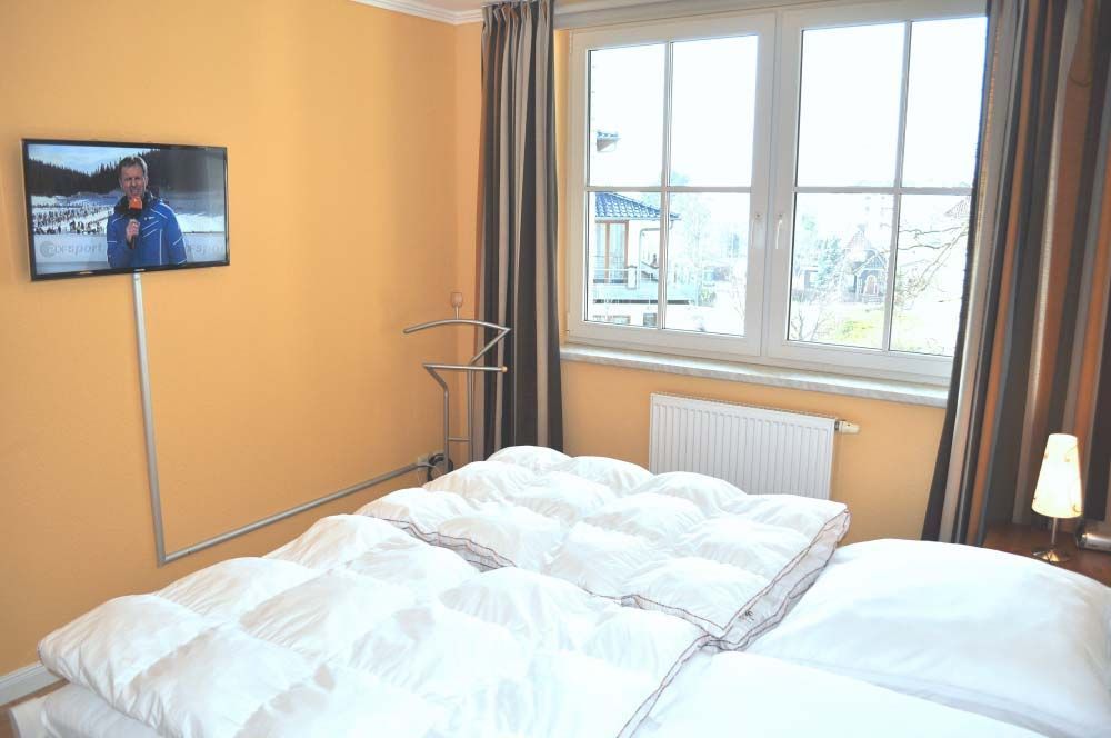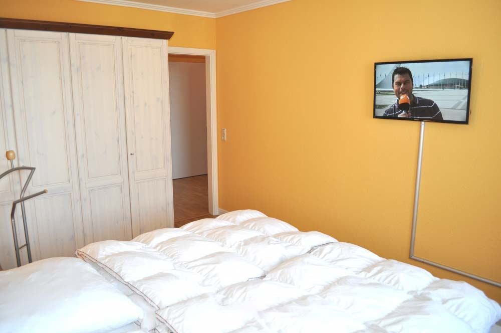 Schlafzimmer 1: 2 Matratzen, 2 Nachttische, 2 stumme Diener, Doppelbett 2,00 x 1,80 m, Flachbildschirm, Kabel-TV, Kleiderschrank, Radiowecker, Spiegel, Wäscheständer