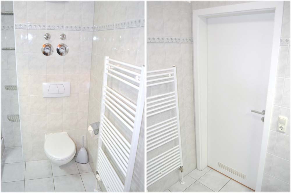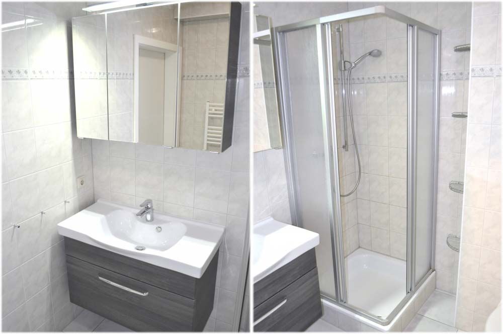Bad 1: Dusche, Duschkabine, Fön, Schrank, Spiegelschrank, Waschtisch, WC