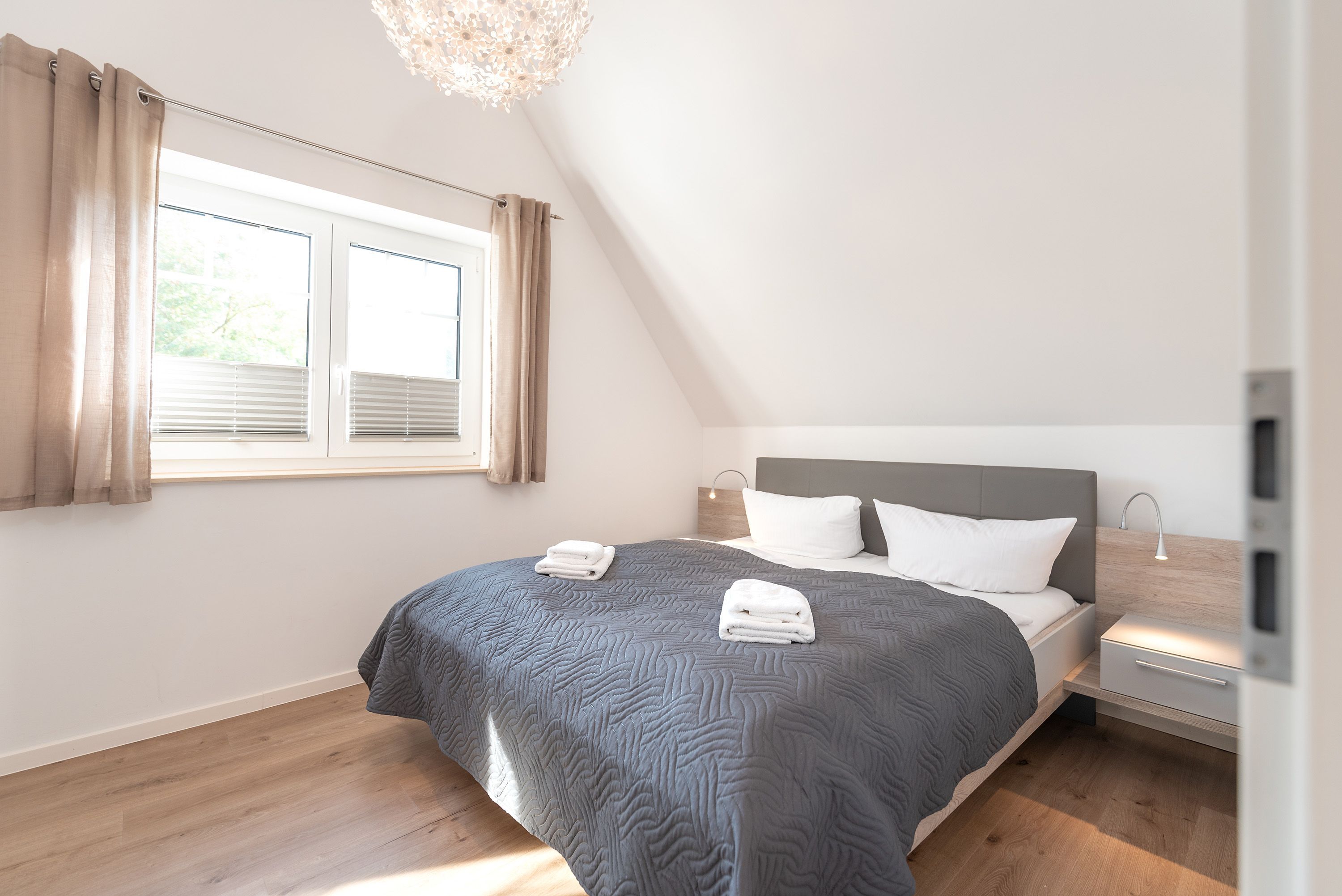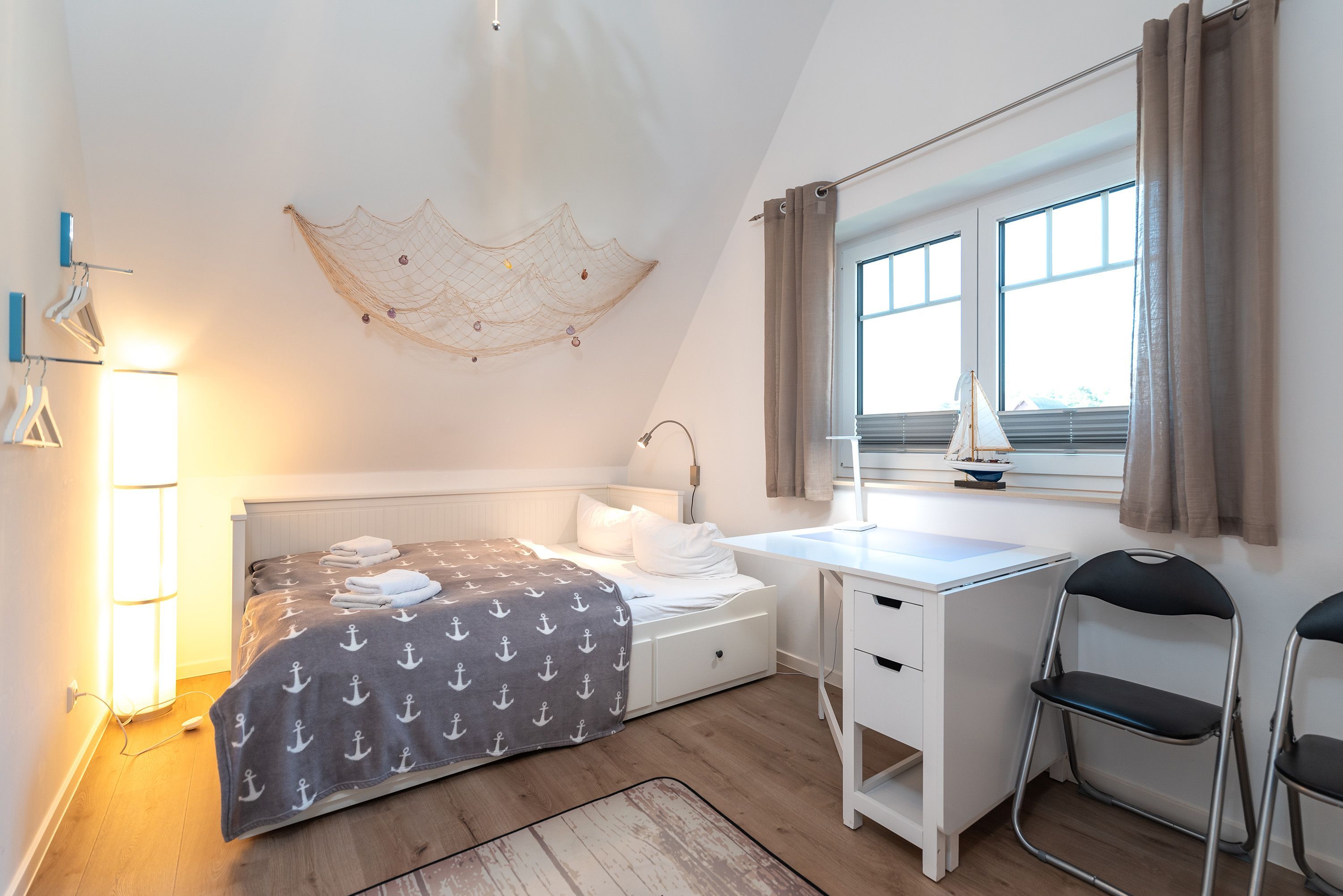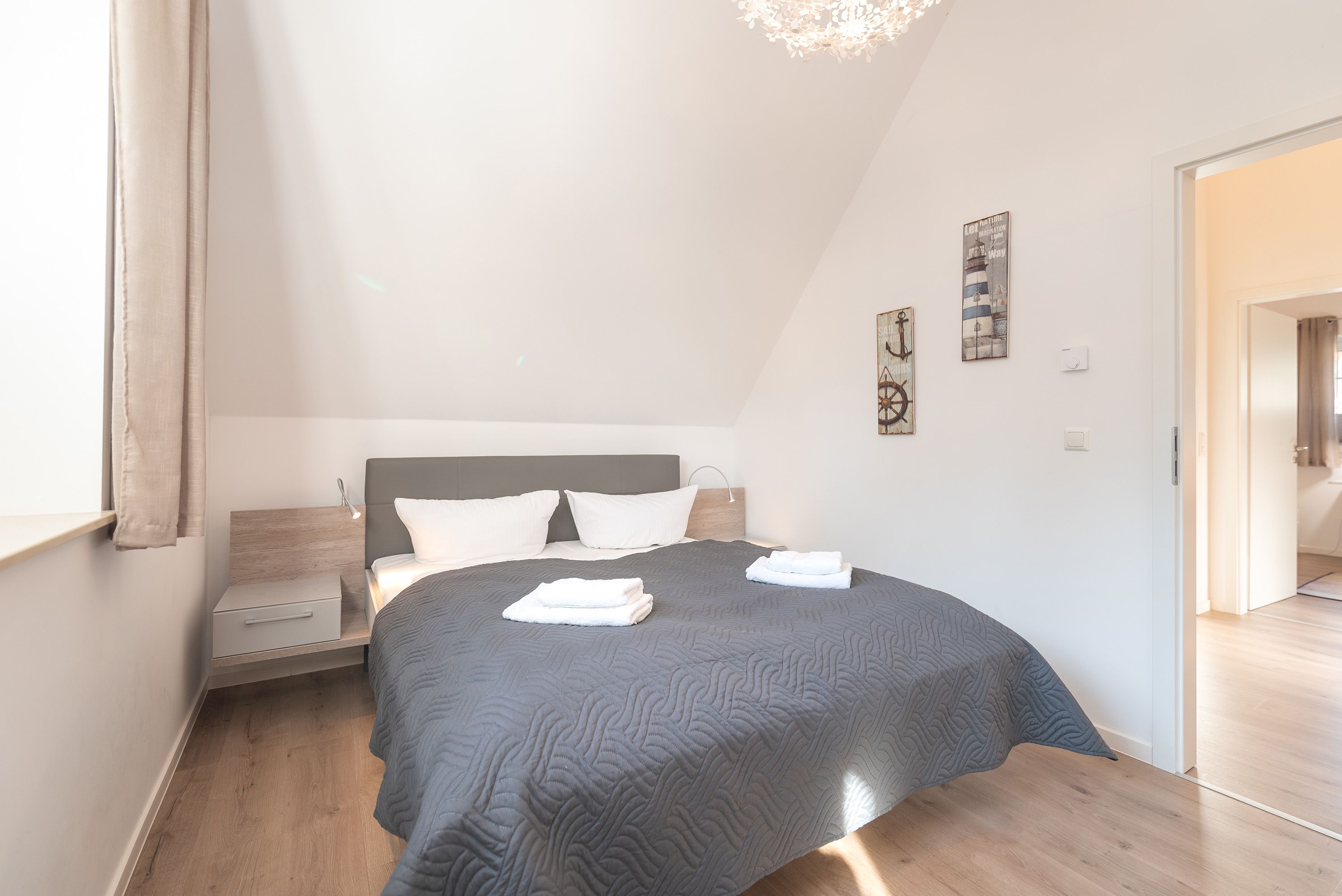 Im Obergeschoss finden Sie zwei liebevoll eingerichtete Schlafzimmer: Das Hauptzimmer verzaubert mit einem komfortablen Doppelbett, während das zweite Zimmer zwei Einzelbetten bereithält, die sich bei Bedarf in ein Doppelbett verwandeln lassen. Somit bietet das Baltic Blue ausreichend Platz für 4 Erwachsene oder für Familien mit bis zu 4 Kindern.