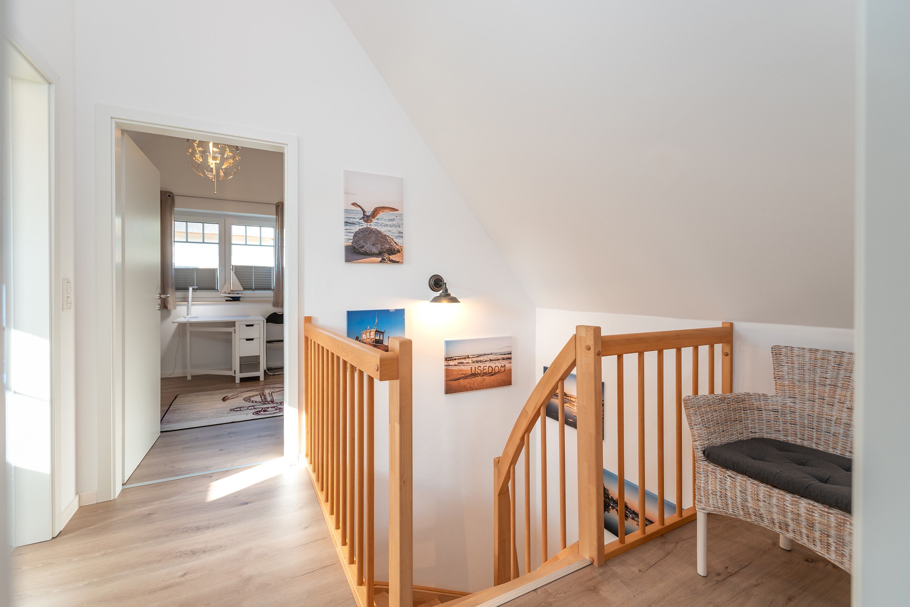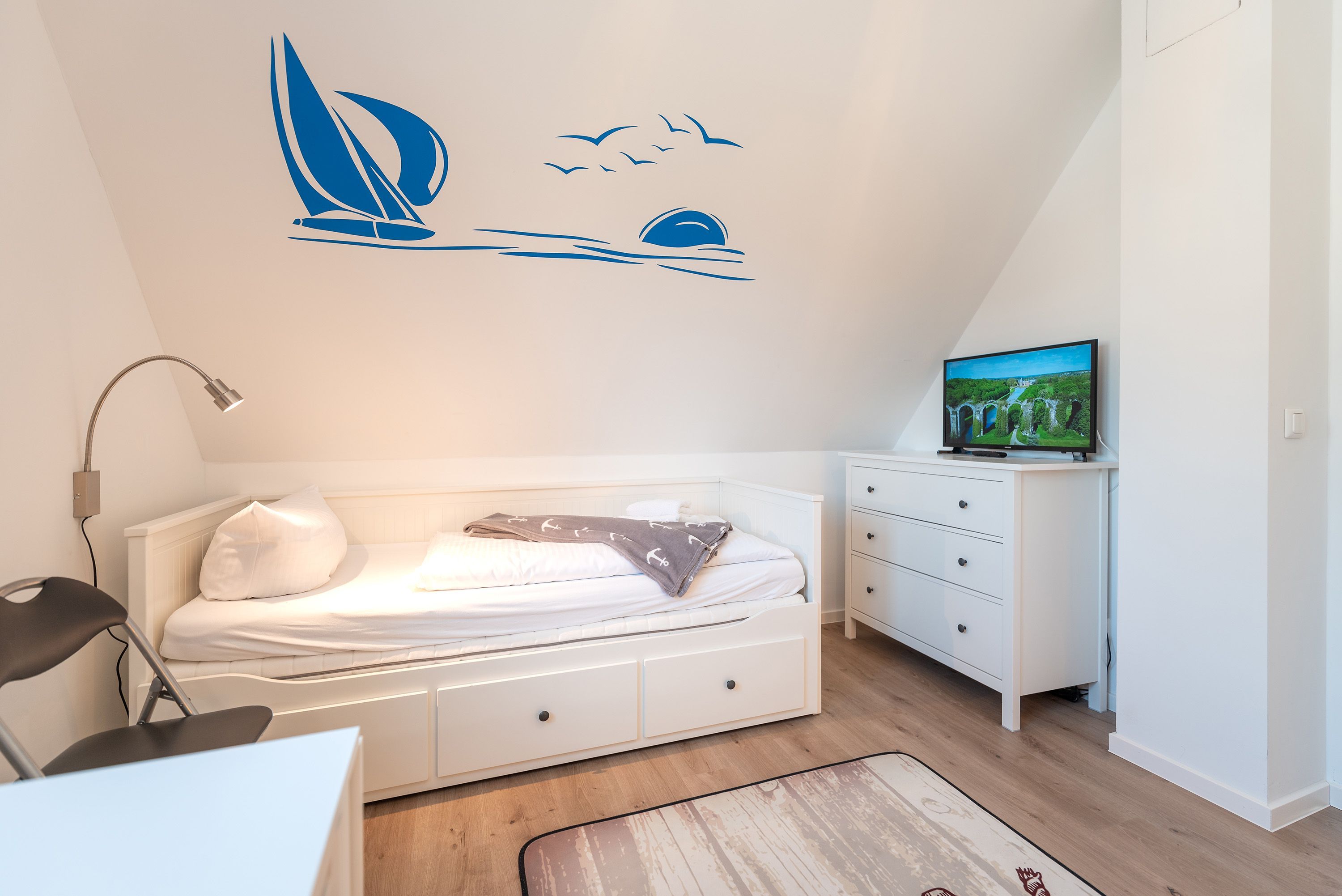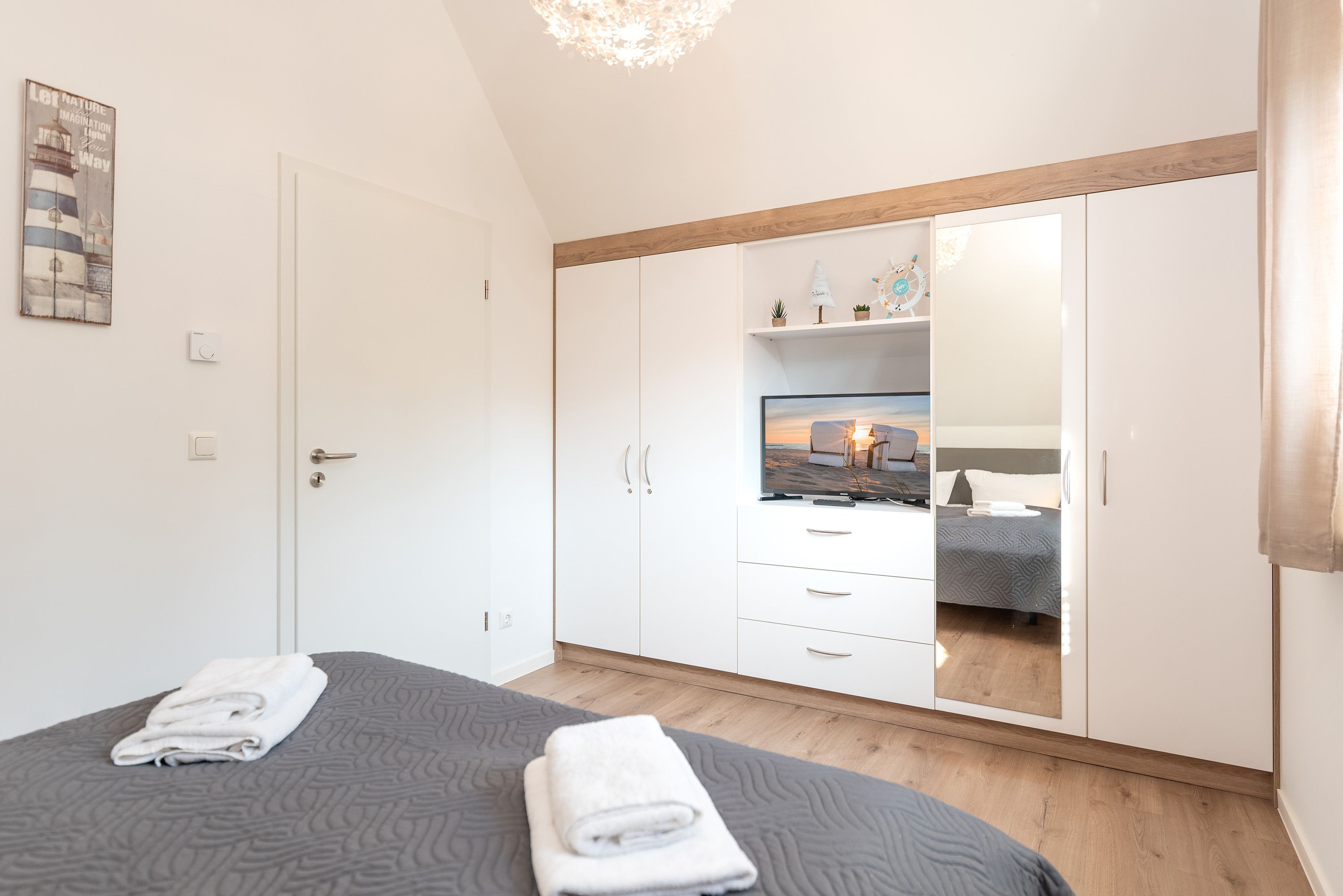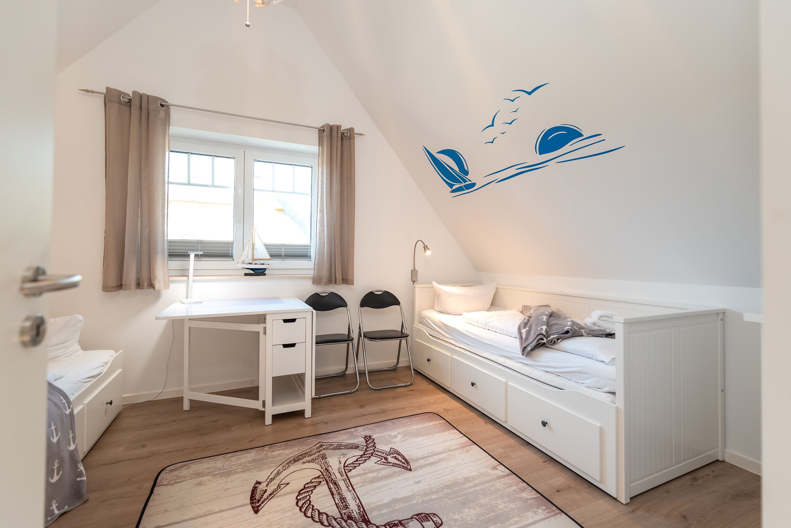 Im Obergeschoss finden Sie zwei liebevoll eingerichtete Schlafzimmer: Das Hauptzimmer verzaubert mit einem komfortablen Doppelbett, während das zweite Zimmer zwei Einzelbetten bereithält, die sich bei Bedarf in ein Doppelbett verwandeln lassen. Somit bietet das Baltic Blue ausreichend Platz für 4 Erwachsene oder für Familien mit bis zu 4 Kindern.