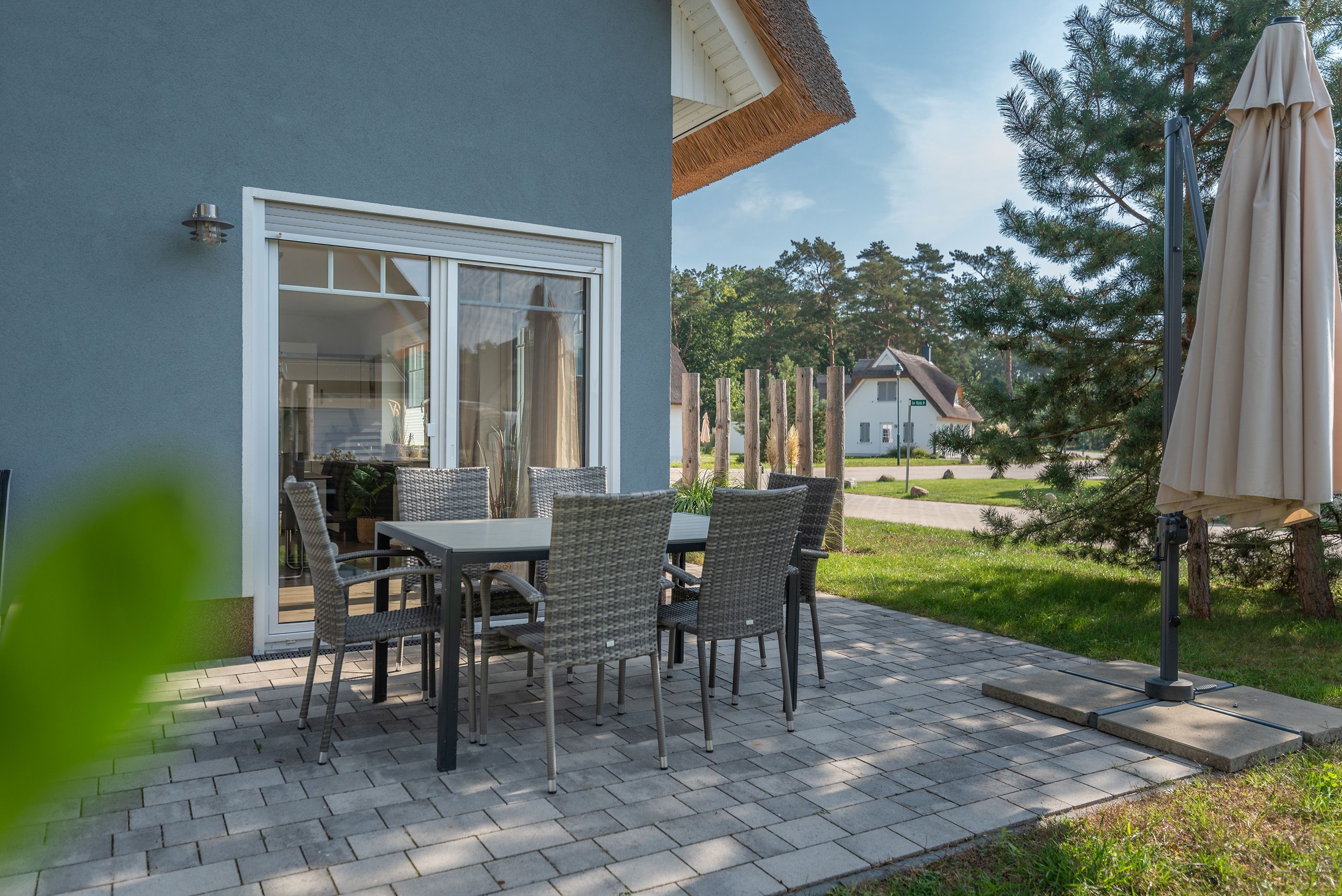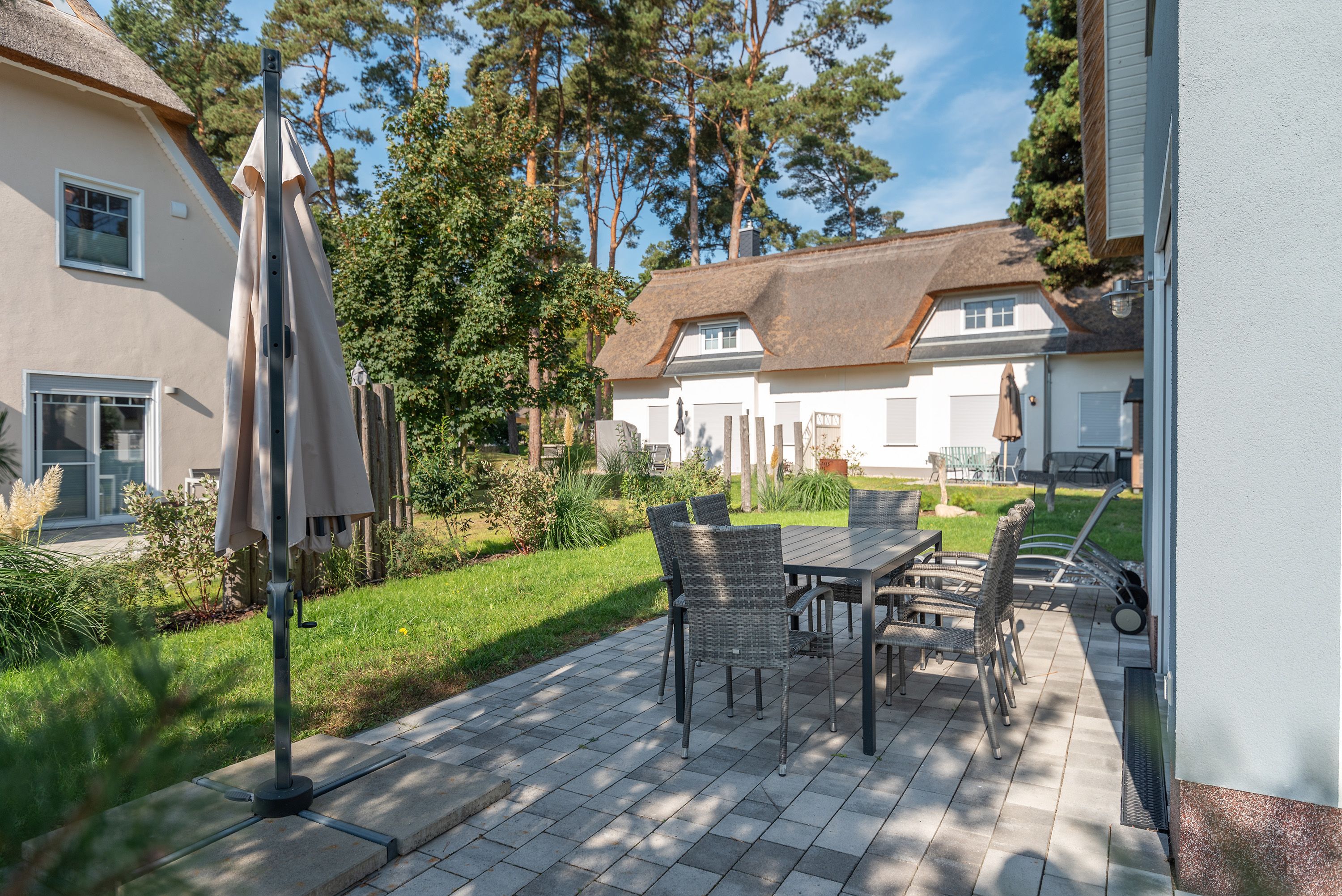Die weitläufige Terrasse lädt zum Verweilen ein: Starten Sie mit einem Frühstück im Freien, sonnen Sie sich auf den bequemen Liegen oder genießen Sie einfach die Ruhe bei einem guten Buch.