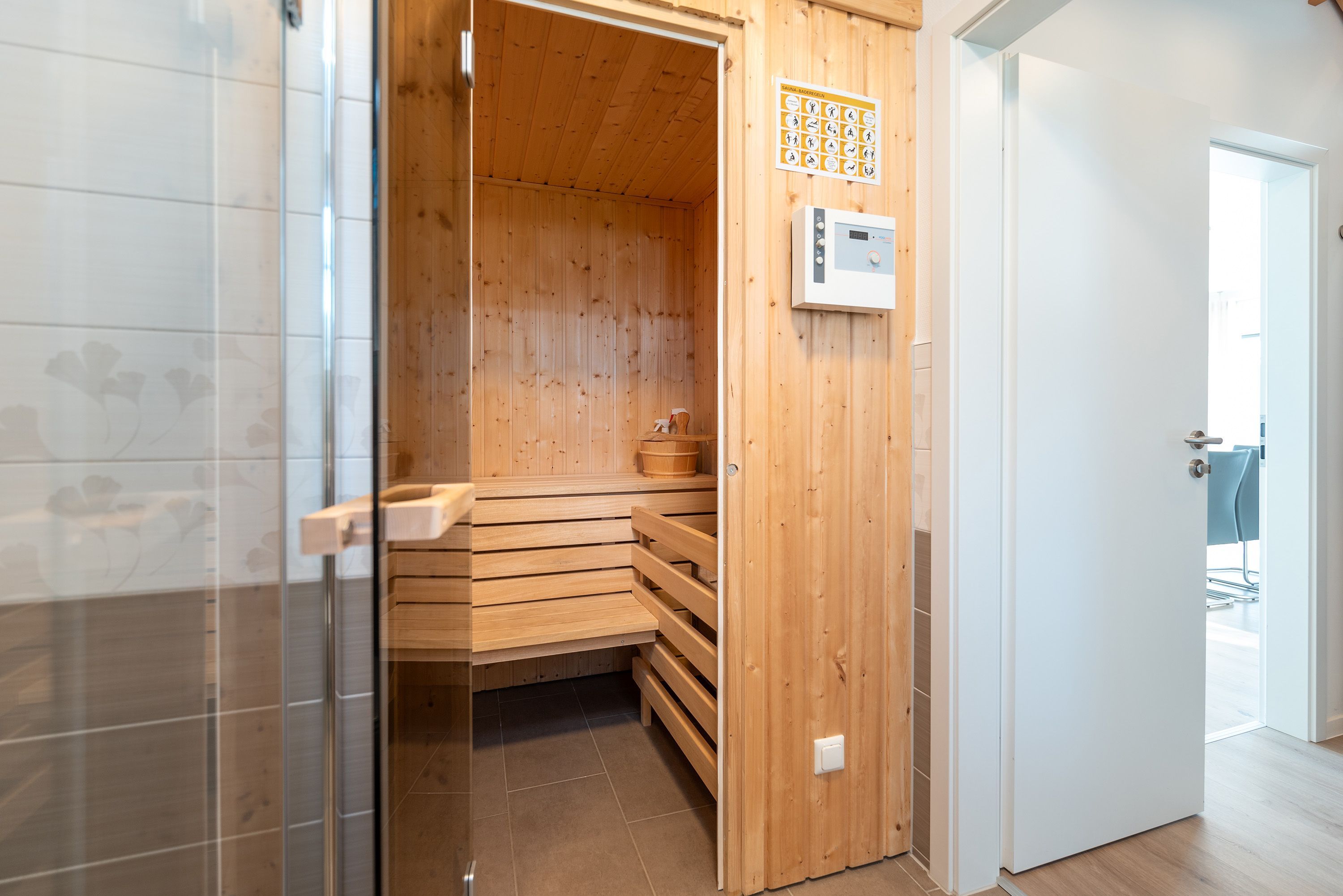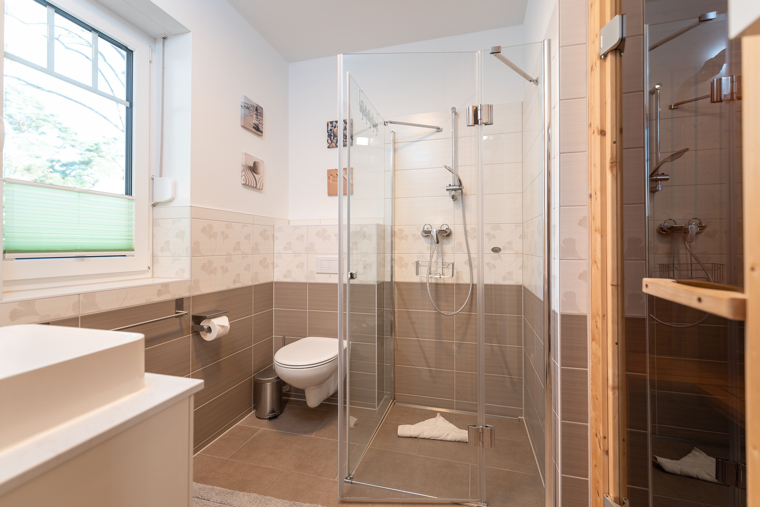 Für Ihr Wellness-Erlebnis sorgen zwei exklusive Bäder. Im Erdgeschoss lädt eine moderne Dusche zum Frischmachen ein, gefolgt von entspannenden Momenten in der hauseigenen Sauna. Das Badezimmer im Obergeschoss verführt mit einer geräumigen Badewanne perfekt für ein duftendes Schaumbad.