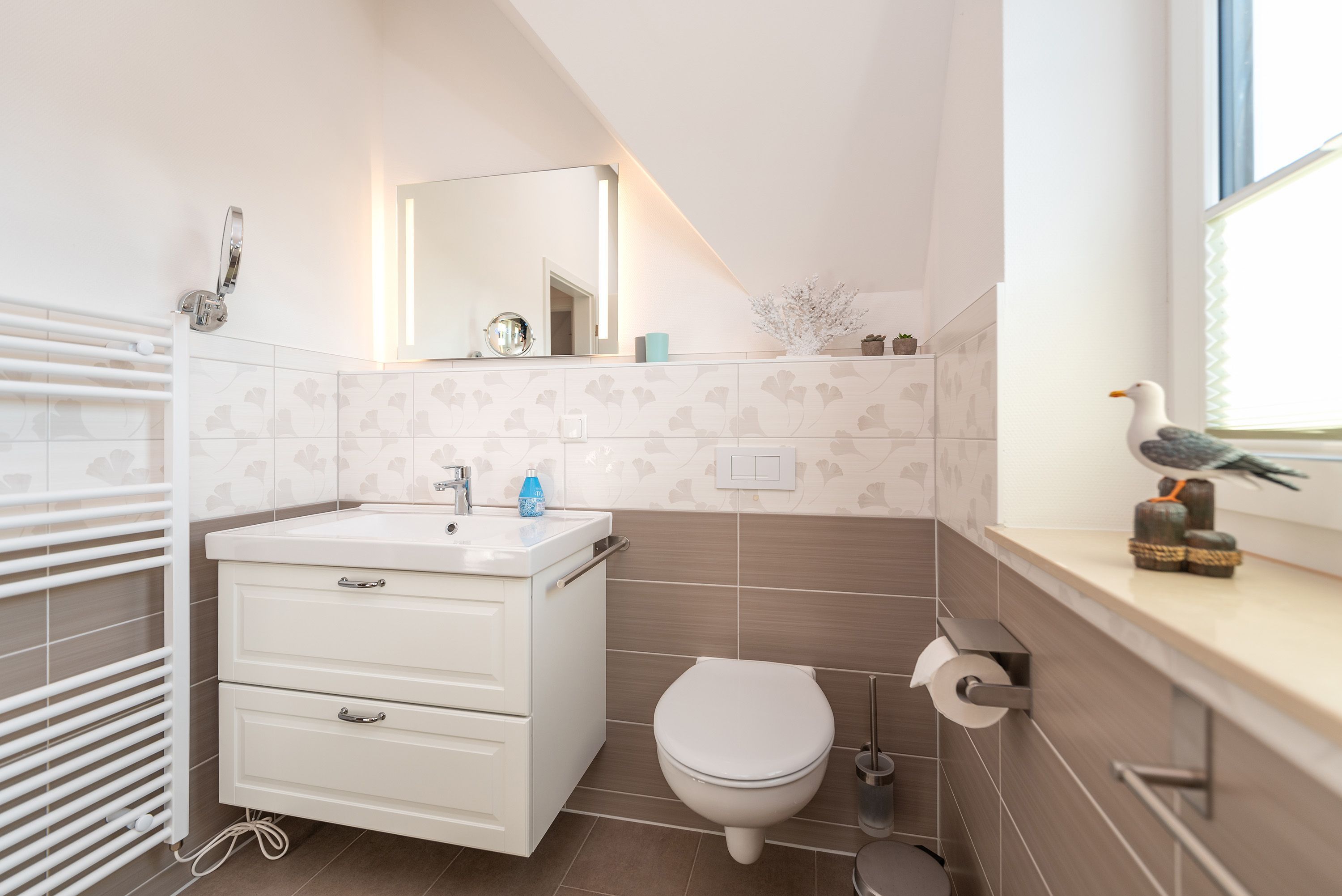 Für Ihr Wellness-Erlebnis sorgen zwei exklusive Bäder. Im Erdgeschoss lädt eine moderne Dusche zum Frischmachen ein, gefolgt von entspannenden Momenten in der hauseigenen Sauna. Das Badezimmer im Obergeschoss verführt mit einer geräumigen Badewanne – perfekt für ein duftendes Schaumbad.