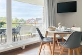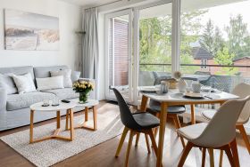 Es erwartet Sie eine geschmackvoll eingerichtete Ferienwohnung mit bodentief verglasten Fensterflächen, die für lichtdurchflutete Räumlichkeiten sorgen, um in einem schönen Ambiente einen entspannten Ostseeurlaub zu verleben. Der große überdachte Sonnenbalkon, der sich über die gesamte Breite der Wohnung erstreckt, ist mit Sonnenliegen, Tisch und Gartenstühlen ausgestattet. Ein herrlicher Rückzugsort zu jeder Tageszeit! Im Wohnbereich erwartet Sie ein hochwertiges Sofa mit Schlaffunktion, TV und Radio. WLAN steht selbstverständlich kostenlos zur Verfügung. Der anschließende Essbereich bietet ausreichend Platz für gemeinsame Mahlzeiten und gemütliches Beisammensein. Die integrierte Einbauküche verfügt über alle technischen Geräte und eine gute Ausstattung, um gemeinsam zu kochen. Das Schlafzimmer ist mit einem hochwertigen Boxspringbett(180x200), einen geräumigen Schrank für die Urlaubsgarderobe und einem zusätzlichen TV eingerichtet. Die gesamte Fensterfläche ist mit Verdunkelungsvorhängen versehen. Das großzügig geschnittene Bad verfügt über Dusche, Waschbecken, WC, Föhn und Handtuchtrockner.