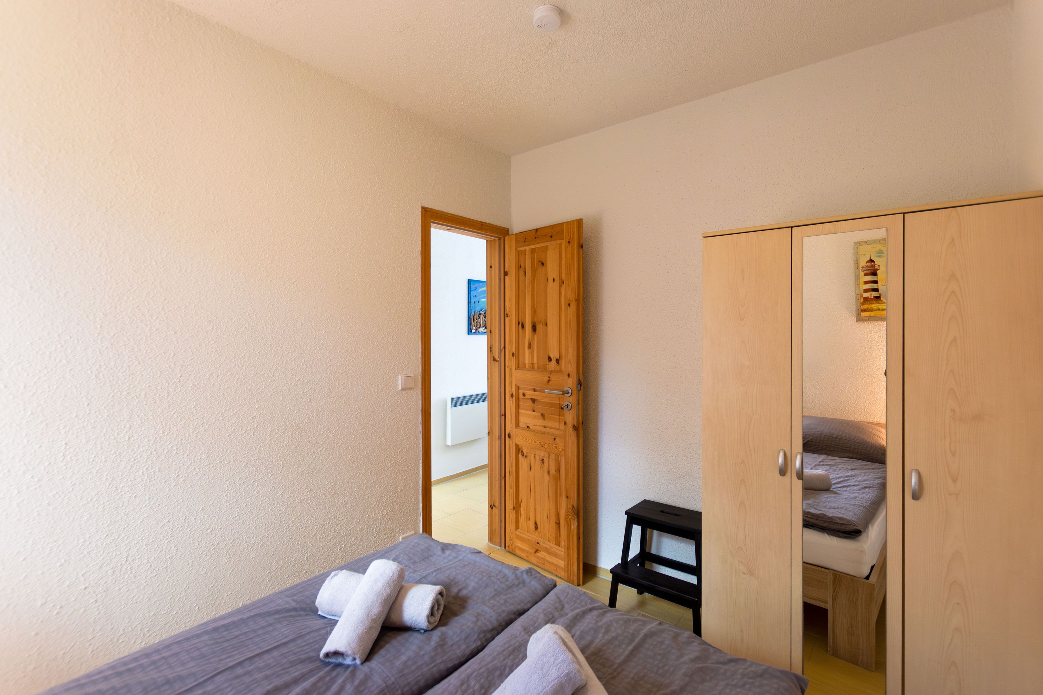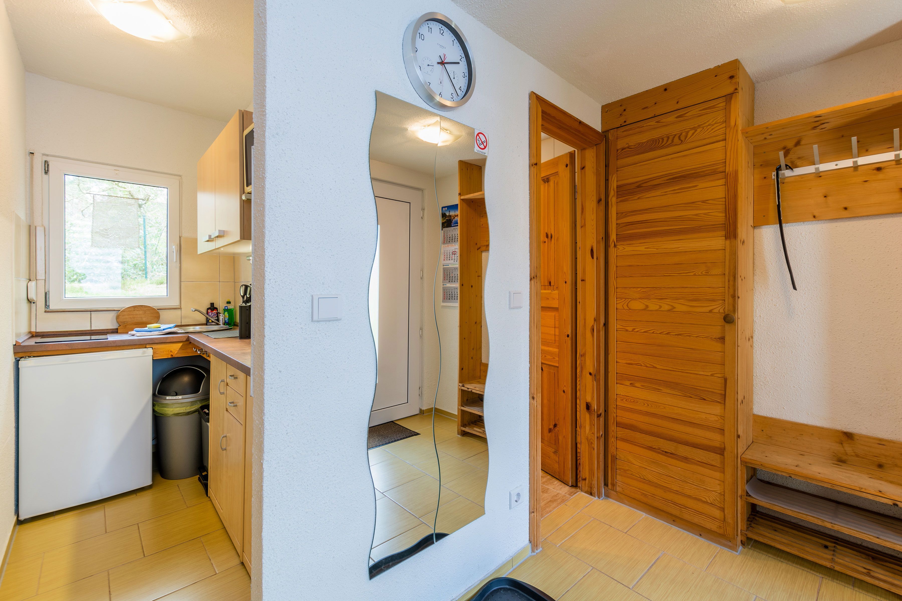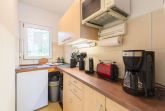 Die offene Küche ist mit einem kleinen Kochfeld, einem Kühlschrank, Kaffeefiltermaschine, Wasserkocher, Toaster sowie einer Mikrowelle ausgestattet. Ein kleiner Essbereich rundet das Gesamtangebot ab. Im Schlafbereich befindet sich ein Doppelbett (140 x 200) und ein Kleiderschrank.