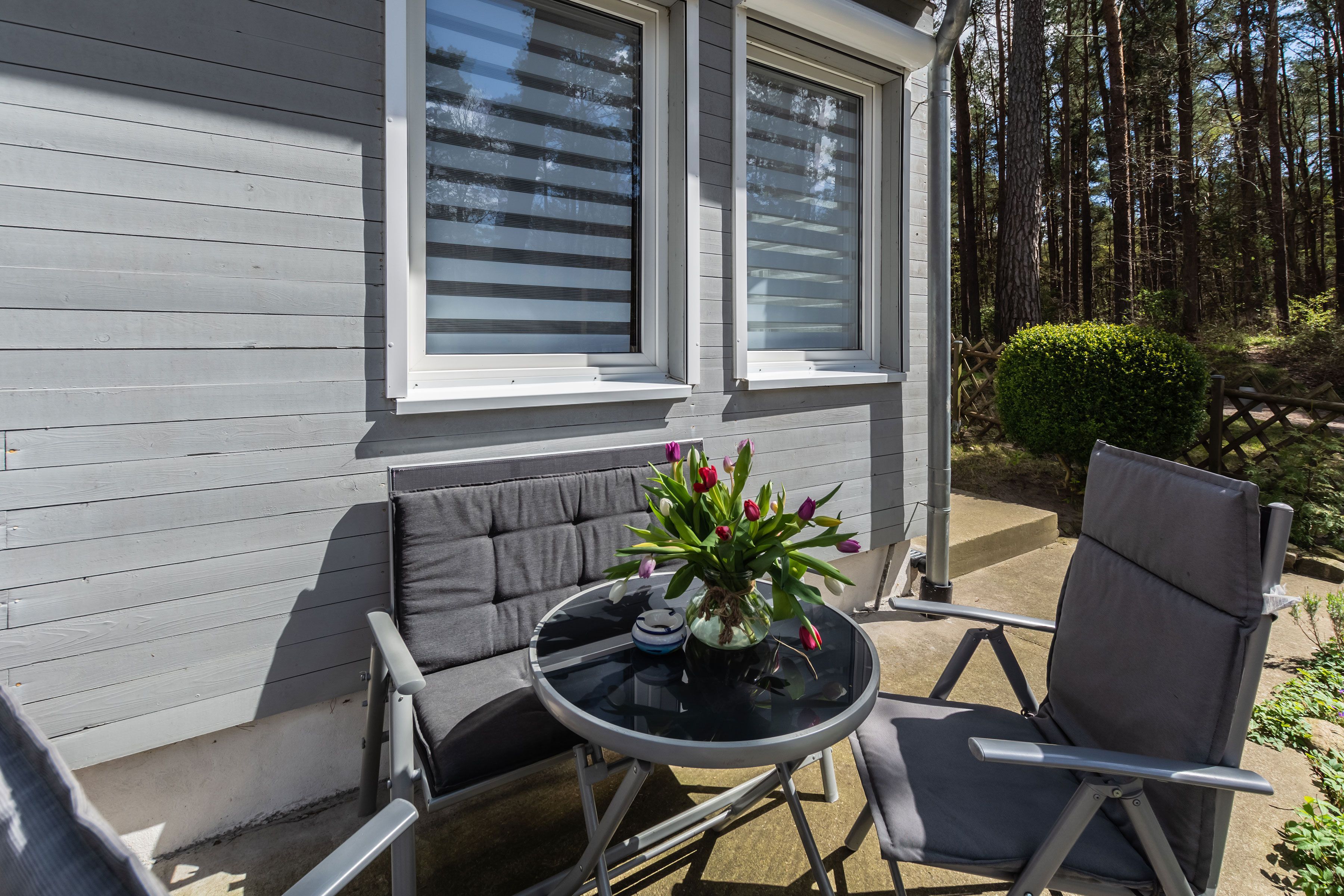 Alle Räume verfügen über Außenjalousien, die zusätzlich die Privatsphäre unterstützen. Auf der sonnigen Terrasse, die man über den Wohnbereich erreicht, stehen Gartenmöbel und ein Holzkohlegrill bereit.