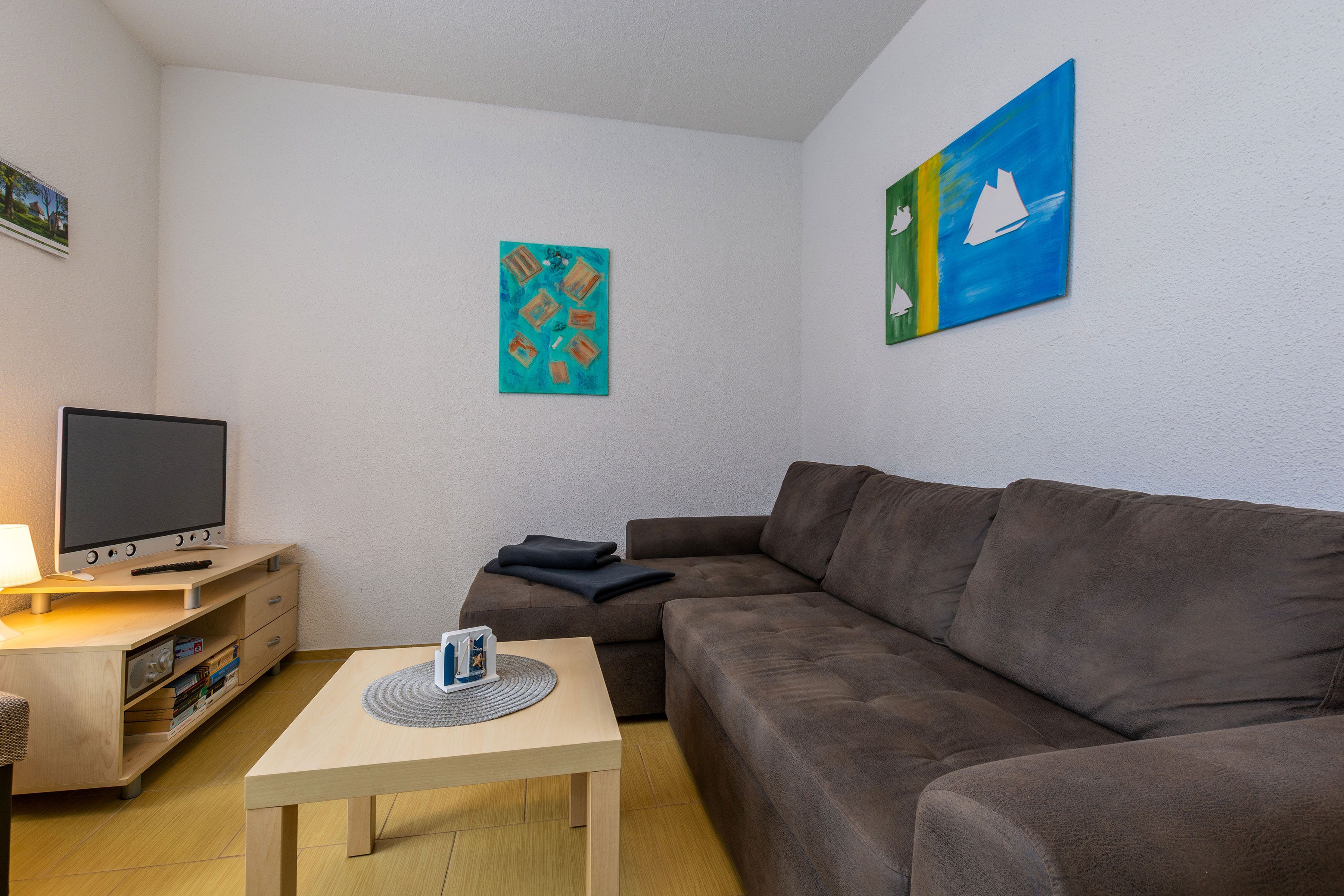 Der gemütliche Wohnbereich überzeugt mit einer Couchgarnitur, einem Fernseher und einem Radio. Zudem können hier 2 weitere Personen auf dem Schlafsofa die Nächte verbringen.