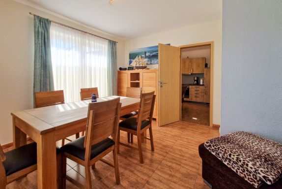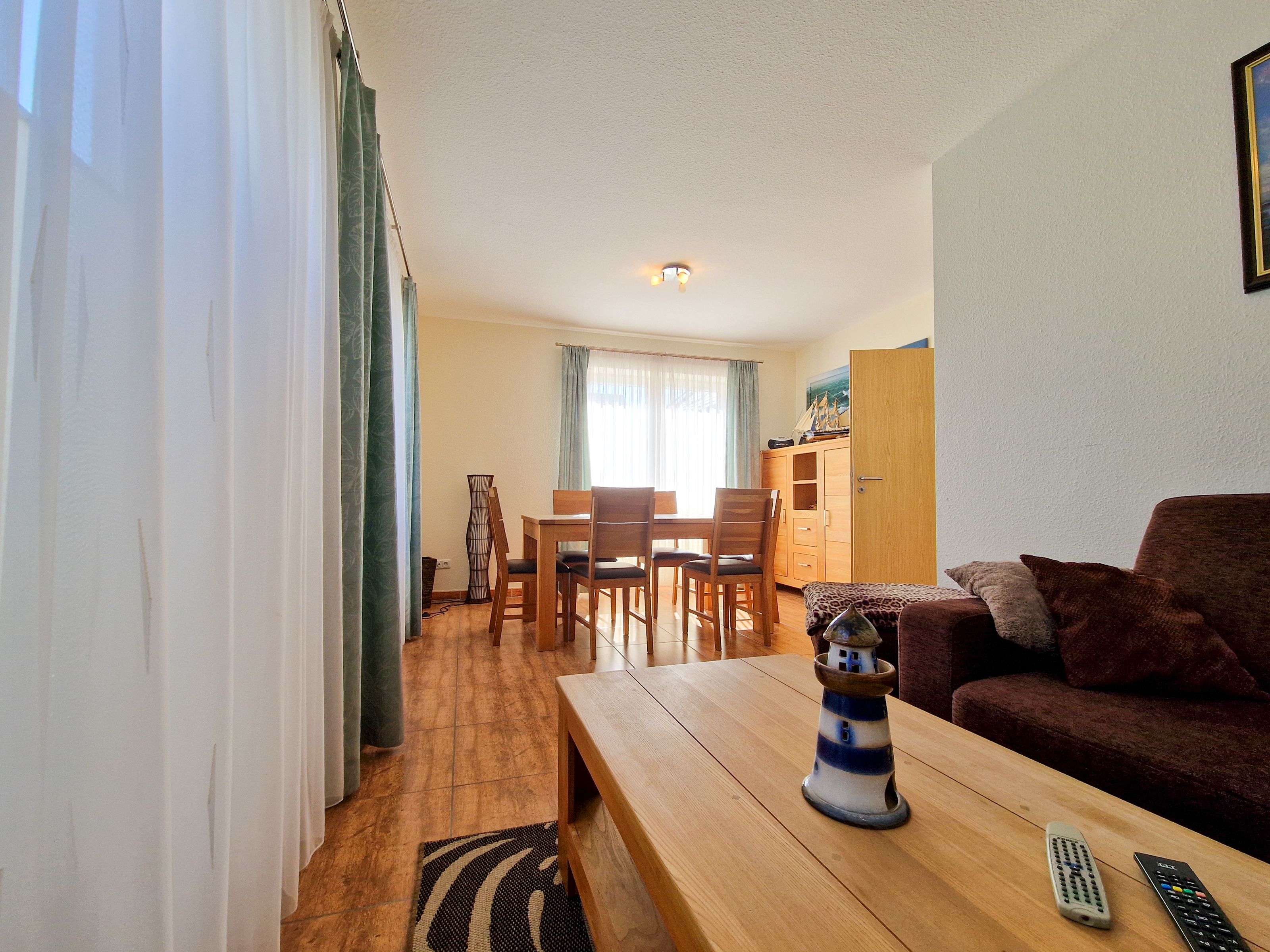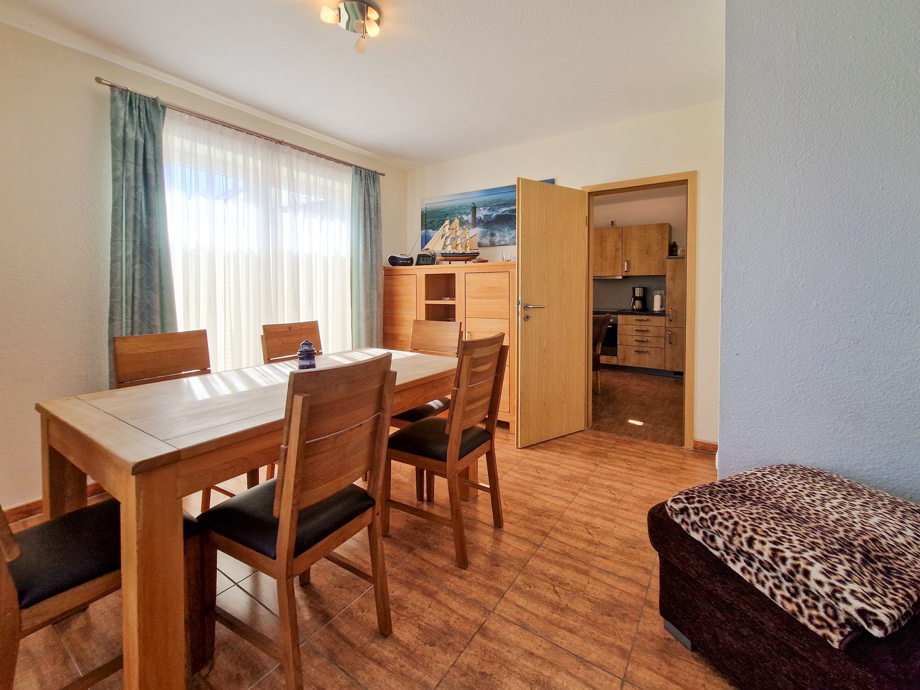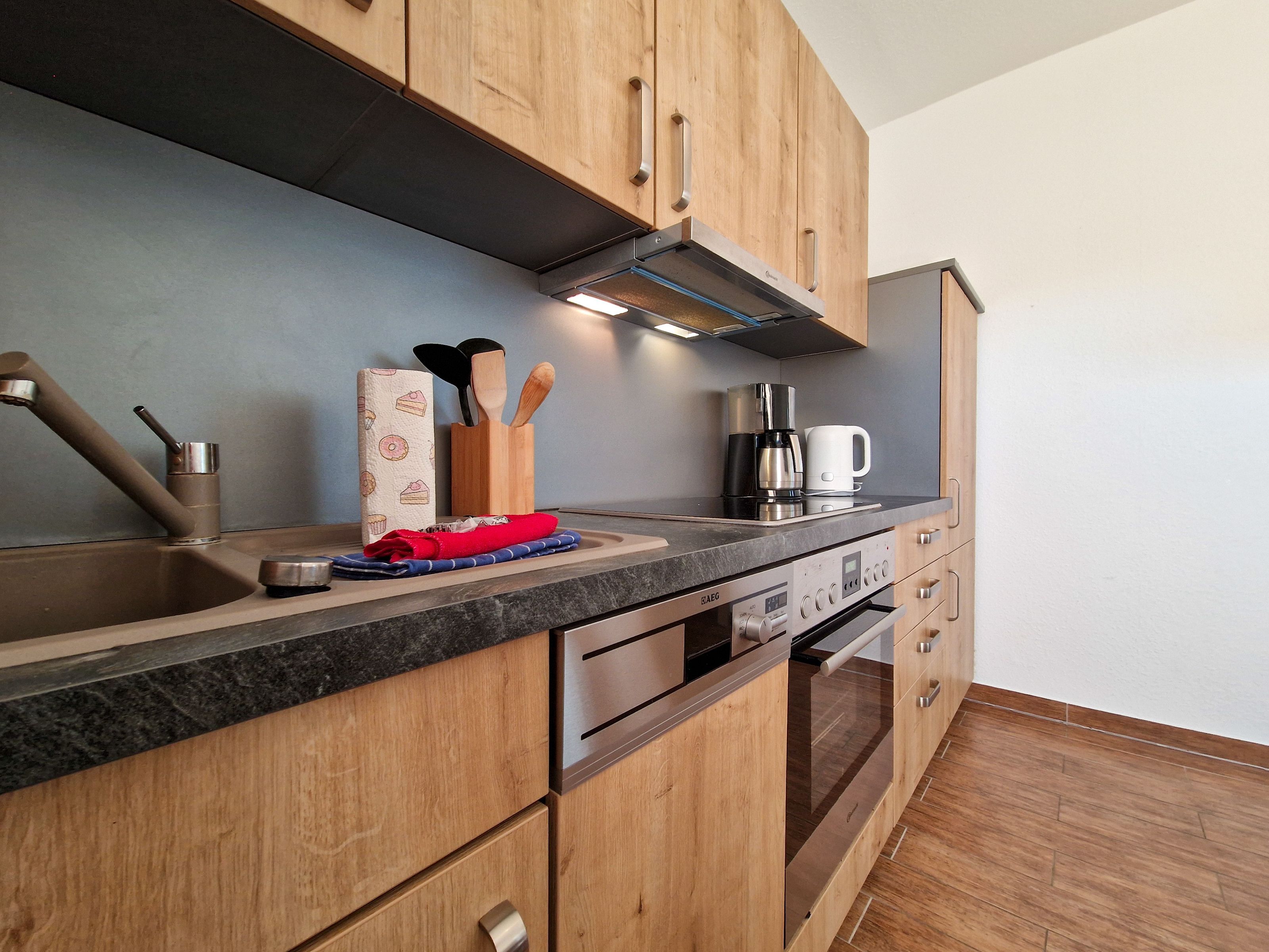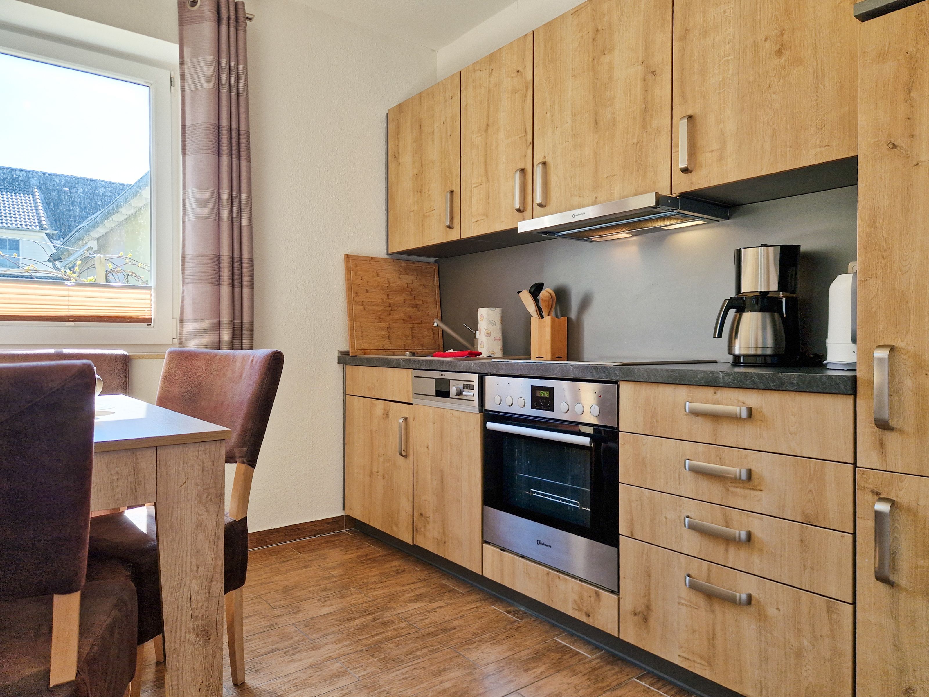 Treten Sie ein in unser gemütliches Ferienhaus „Zur Reling: Vom Flur aus gelangen Sie in den großzügigen Wohnraum mit einer vollständig ausgestatteten Küchenzeile, wo Ihnen ein Herd, ein Ofen, ein Geschirrspüler, eine Kaffeemaschine, ein Wasserkocher und vieles mehr zur Verfügung stehen, damit Sie hier Ihre Lieblingsspeisen zubereiten können. Gemeinsam können Sie am hölzernen Esstisch kulinarische Highlights genießen oder Sie machen es sich auf der bequemen Couch vor dem Flat-TV gemütlich.